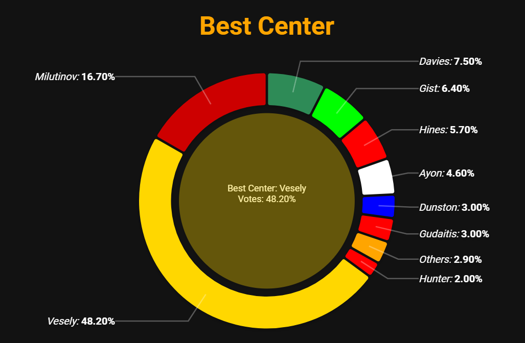 Ακόμα μια θέση με μεγάλη γκάμα επιλογών αλλά και με ξεκάθαρο νικητή και εδώ, τον Τσέχο Jan Vesely, που ειδικά μετά τη φυγή του Udoh, αποτέλεσε τον αδιαμφισβήτητα κορυφαίο ψηλό τόσο της ομάδας του όσο και ολόκληρης της διοργάνωσης! Ο Vesely έλαβε το 63% των ψήφων σας ως ο καλύτερος Center της σεζόν και το 18.5% ως δεύτερος καλύτερος στη θέση (λογικό να είναι χαμηλότερα), κάτι που μεταφράζεται σε ποσοστό 48.2% και είναι απολύτως φυσιολογικό τη χρονιά που ο Τσέχος έφτασε τους 12.9 πόντους, τα 5.2 ριμπάουντ και τις 16.8 μονάδες αξιολόγησης κατά μ.ο. με μια άκρως κυρίαρχη παρουσία στα 32 (από τα 34) παιχνίδια που αγωνίστηκε.