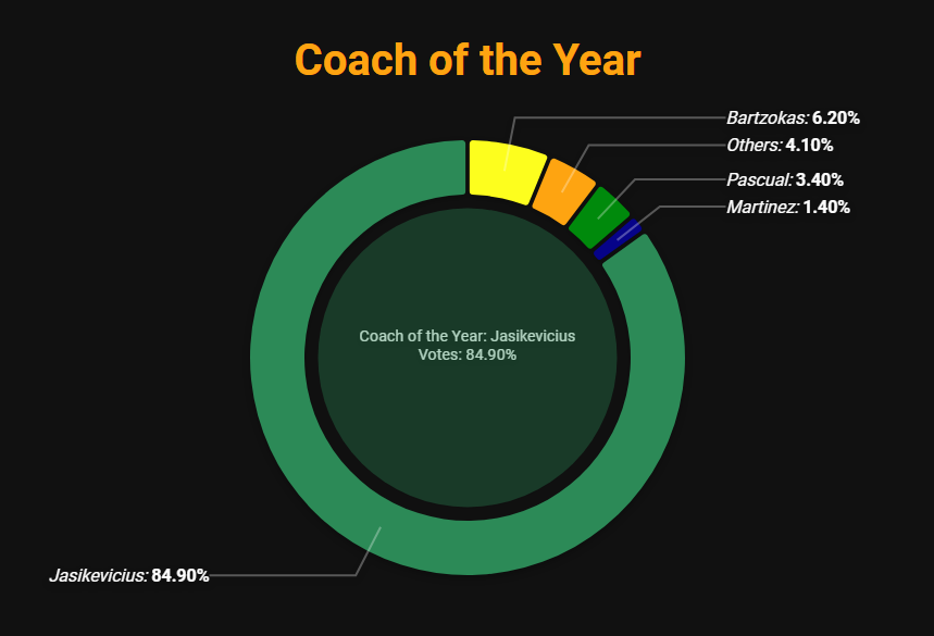 Πιο πίσω συναντάμε τον Τσάβι Πασκουάλ (3.4%) που κατάφερε μεν να φέρει για δεύτερη συνεχομένη χρονιά στον Παναθηναϊκό το πλεονέκτημα της έδρας, πάλι όμως η σειρά κατέληξε στον αντίπαλο, παρά το γεγονός πως οι «Πράσινοι», μετά το εκπληκτικό Game 1, πάλεψαν, ειδικά στην Μαδρίτη, και θα μπορούσαν να έχουν πάρει κάτι καλύτερο από το τελικό 1-3. Τέταρτος ήρθε στις προτιμήσεις σας ο «αναμορφωτής» της Μπασκόνια Πέντρο Μαρτίνεζ, με τον Ισπανό coach να αναλαμβάνει μετά το αρχικό αποτυχημένο πείραμα «Πριχιόνι» και να πετυχαίνει στο ...νήμα την πολυπόθητη είσοδο στην postseason, όπου όμως το εμπόδιο της Φενέρ αποδείχτηκε ανυπέρβλητο.