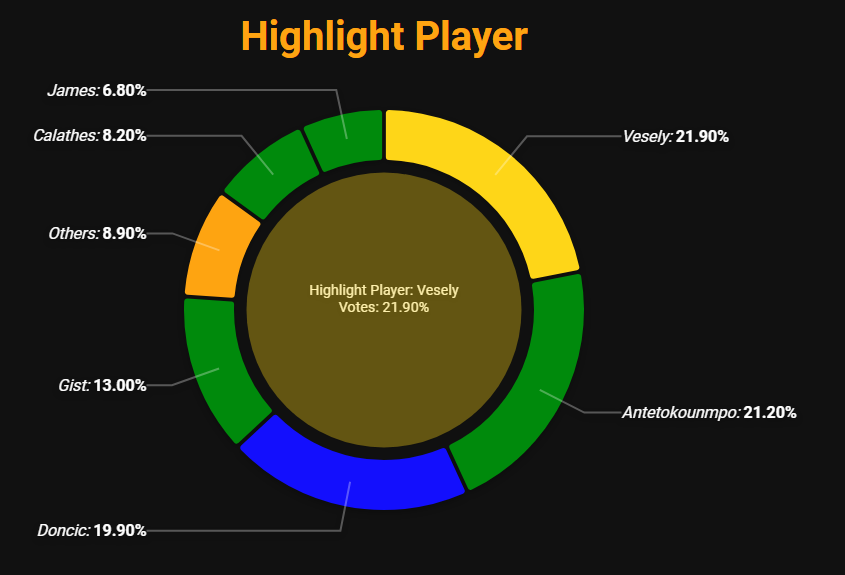 Μια νέα κατηγορία προστέθηκε στη φετινή ψηφοφορία, αυτή του πιο θεαματικού παίκτη της διοργάνωσης, όπου και είχαμε το απόλυτο «ντέρμπι» με την επικράτηση του Jan Vesely έναντι του Θανάση Αντετοκούνμπο να είναι εντελώς οριακή, με τη διαφορά τους να βρίσκεται μόλις στο 0.7% (21.9% ο Τσέχος έναντι 21.2% του Θανάση).