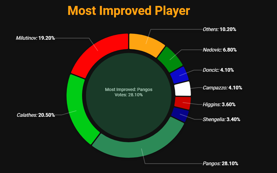 Την καλύτερη δεκάδα της διοργάνωσης, ως δεύτερος καλύτερος Center της φετινής EuroLeague, συμπληρώνει ακόμα ένας παίκτης του Ολυμπιακού, ο Nikola Milutinov, με τον Σέρβο να είναι πραγματικά εντυπωσιακός φέτος, όντας ένας, όπως θα δούμε και παρακάτω, από τους πιο βελτιωμένους παίκτες της χρονιάς. Ο Milutinov συγκέντρωσε το 16.7% των επιλογών σας, αρκετά πάνω από το 7.5% του τρίτου Brandon Davies, που έφτασε τόσο ψηλά χάρη στις εκπληκτικές του εμφανίσεις στα Playoffs εναντίον των Ερυθρολεύκων.