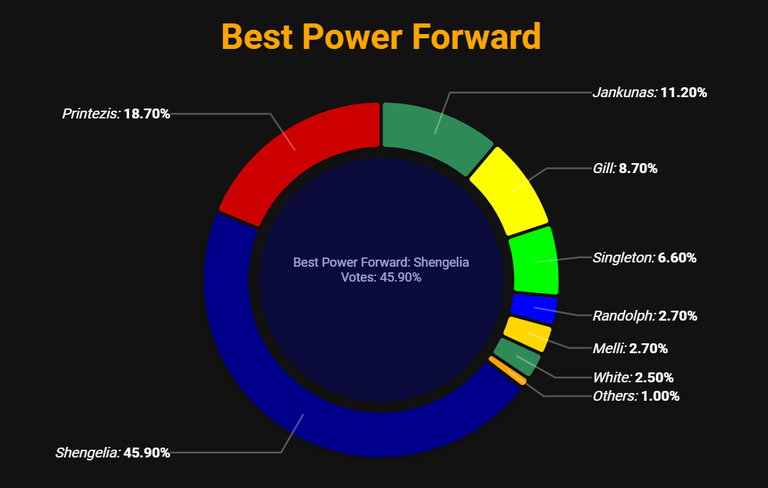 Ακόμα μια θέση όπου το απόλυτο φαβορί αναδείχθηκε, δικαιότατα, ως ο κορυφαίος και αυτός δεν ήταν άλλος από το Γεωργιανό «άτι», τον Tornike Shengelia. Ο PF της Μπασκόνια συγκέντρωσε το 45.9% των συνολικών σας ψήφων, ένα ποσοστό που βέβαια βρισκόταν σχεδόν 20 ποσοστιαίες μονάδες πάνω (63.7%) στις επιλογές σας ως top Power Forward και αναμενόμενα έπεσε από τις λίγες ψήφους που συγκέντρωσε στην επιλογή για δεύτερος καλύτερος της θέσης.