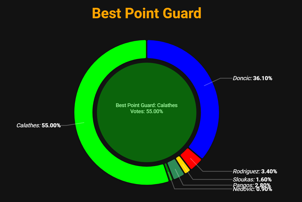 Εφόσον τον ανακηρύξατε ως MVP της χρονιάς, δεν θα μπορούσε να μην είναι και ο πρώτος και καλύτερος PG των επιλογών σας. Ο Καλάθης συγκέντρωσε το 55% των προτιμήσεών σας, έχοντας πάντως ισχυρό, προφανώς, ανταγωνισμό από τον Luka Doncic που έλαβε το 36.1% των επιλογών σας, ποσοστό σαφώς ψηλότερο συγκριτικά με το 28% που έλαβε στη «μάχη» για την κατηγορία του MVP.