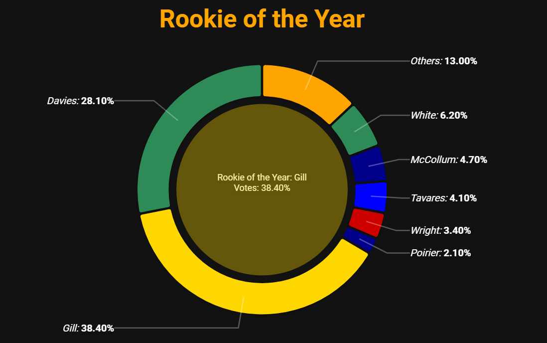 Αυτό φάνηκε και από τις δικές σας ψήφους, οι οποίες ανέδειξαν, με ποσοστό 38.4%, τον Anthony Gill ως τον κορυφαίο ρούκι, με τον εκπληκτικό Brandon Davies της Ζαλγκίρις να ακολουθεί, κατά πόδας, με ποσοστό 28.1%. Ο Αμερικανός της Χίμκι, μετά από ένα απαιτούμενο διάστημα προσαρμογής, απέδειξε για τα καλά γιατί ήταν μια από τις πρώτες επιλογές του Γιώργου Μπαρτζώκα με το που ανέλαβε το τιμόνι της Χίμκι, δείχνοντας το πλούσιο ταλέντο του και στις δύο μεριές του παρκέ ολοκληρώνοντας τη χρονιά με 11.8 πόντους, 4.5 ριμπάουντ και 13.1 μονάδες στο σύστημα αξιολόγησης, με τα νούμερά του πάντως στα Playoffs να «εκτινάσσονται» στους 16.8 πόντους και 20 Index Rating, όντας ουσιαστικά το Νο. 2 της ομάδας του, πίσω από τον «πυραυλοκίνητο» Alexey Shved, στην πετυχημένη φετινή τους πορεία, ένα βήμα μακριά από το Final-4.