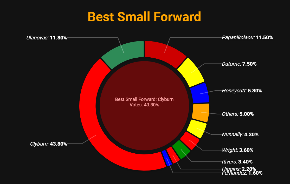 Μια θέση μόνος του αποτέλεσε τη φετινή χρονιά ο Clyburn ως SF και όσοι ασχοληθήκατε και με το fantasy θα το ...νιώσατε για τα καλά στο πετσί σας, με τον Αμερικανό της ΤΣΣΚΑ να είναι το αδιαφιλονίκητο Νο.1 της θέσης. Έτσι και στις επιλογές σας, ο Clyburn επικράτησε άνετα με το χαμηλό για τα δεδομένα της θέσης 43.8%, αυτό όμως αφενός έγινε λόγω του μεγάλου κατακερματισμού των ψήφων σας (πολλοί παίκτες με μικρά ποσοστά), την στιγμή που αφετέρου ο δεύτερος βρίσκεται πολύ χαμηλότερα και δη 32 ολόκληρες ποσοστιαίες μονάδες πίσω του.