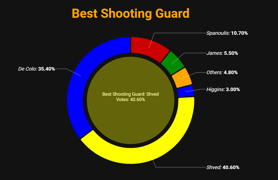 Μάχη σώμα με σώμα και σε αυτήν την κατηγορία με τους δύο αστέρες των δύο ρωσικών ομάδων, Shved και De Colo, να είναι οι απόλυτοι πρωταγωνιστές, με τον Ρώσο τελικά να επικρατεί με ποσοστό 40.6% έναντι 35.4% του Γάλλου. Ο πρώτος σκόρερ της φετινής διοργάνωσης ολοκλήρωσε τη σεζόν με 21.8 πόντους, 5.2 ασσίστ και 20.4 μονάδες στο σύστημα αξιολόγησης, με τα νούμερά του πάντως να είναι σαφώς μεγαλύτερα στα Playoffs (24.3 πόντοι, 5.8 ασσίστ, 23.3 PIR) όπου λίγο έλειψε να οδηγήσει την ομάδα του σε μια έκπληξη ...μεγατόνων. Αυτό, σε συνδυασμό με την απουσία του De Colo, λόγω του τραυματισμού του στο Game 1, προφανώς και έγειραν τις προτιμήσεις σας υπέρ του Ρώσου, με τον Γάλλο εξάλλου να λαμβάνει μεγαλύτερο ποσοστό στις προτιμήσεις σας ως δεύτερος καλύτερος SG (37.7%) έναντι του Shved (27.4%) και να κλείνει έτσι τη μεγαλύτερη διαφορά που είχε δημιουργηθεί από τις ψήφους στο «Νο.1» της θέσης.