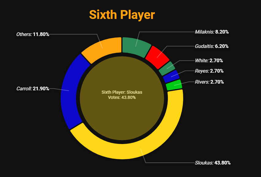 Έτσι, και με σχεδόν υπερδιπλάσιο ποσοστό από τον δεύτερο, καλύτερος 6ος παίκτης της φετινής διοργάνωσης, σύμφωνα με τις δικές σας αποφάσεις, αναδεικνύεται ο Κώστας Σλούκας με ποσοστό 43.8%. Ο Έλληνας PG της Φενέρ πραγματοποίησε εξαιρετική χρονιά και ήταν ο πραγματικός «στρατηγός» για την ομάδα του Ζέλικο Ομπράντοβιτς εντός παρκέ, σε μια χρονιά όπου οι πρωταθλητές Ευρώπης έχασαν τόσο τον Ekpe Udoh όσο και τον Bogdan Bogdanovic, παρόλα αυτά δεν δυσκολεύτηκαν να φτάσουν σε ακόμα ένα Final-4 τα τελευταία χρόνια. Ο Σλούκας αγωνίστηκε σε 33 από τα 34 συνολικά παιχνίδια, έως τώρα, της ομάδας του και στα 23 από αυτά ήρθε από τον πάγκο, για να ολοκληρώσει τη σεζόν με 10 πόντους, 2.6 ριμπάουντ, 5.5 ασσίστ και 13 Index Rating σε 24:44 λεπτά συμμετοχής ανά αγώνα.