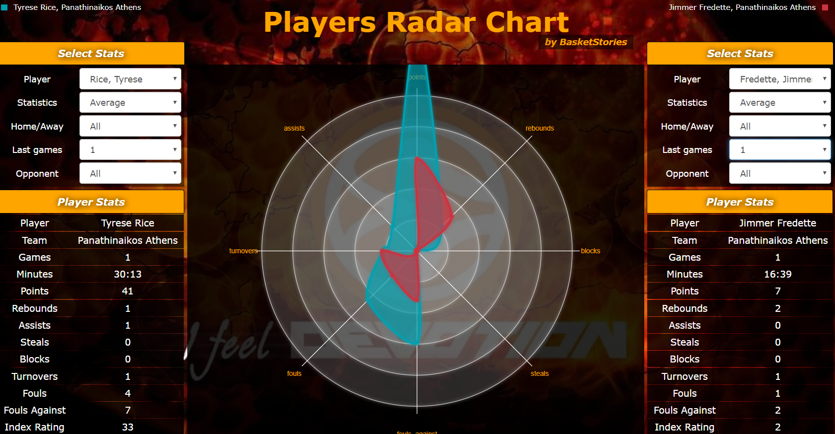 O Rice "εκτέλεσε" έξω από τα 6,75μ. (και όχι μόνο) τον Ολυμπιακό, με 8/16 τρίποντα, κερδίζοντας παράλληλα 7 φάουλ σε 30:13 συμμετοχής, για 33 μονάδες Index Rating, βγαίνοντας εκτός ορίων του Radar Chart, στη διάσταση των πόντων!