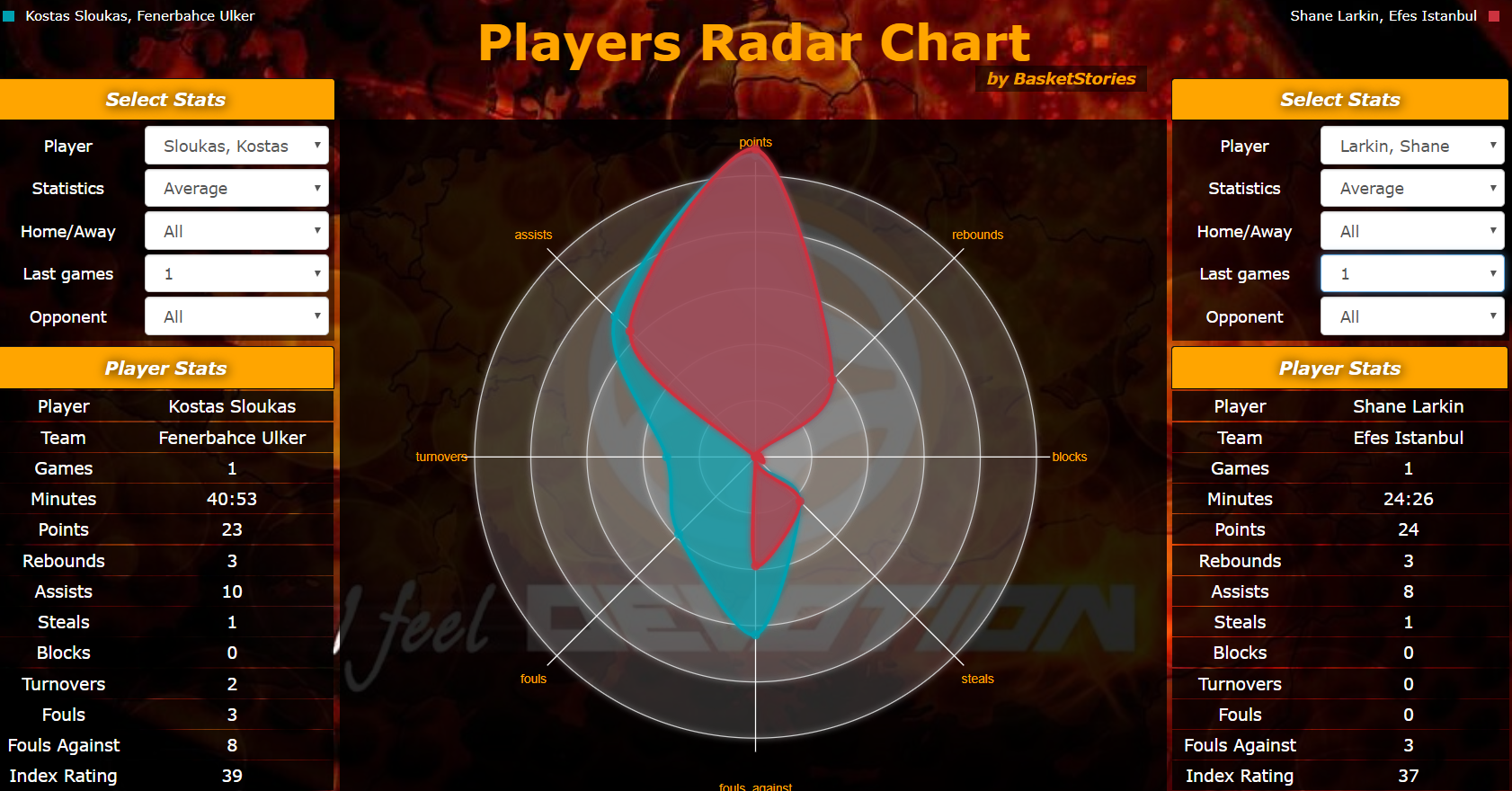 Όπως φαίνεται εύκολα, η παρουσία του Σλούκα ήταν πιο ...πληθωρική (μπλε χρώμα), όχι μόνο σε ασσίστ και κερδισμένα φάουλ, αλλά ακόμα και στις αρνητικές κατηγορίες, όπως τα λάθη και τα φάουλ, οδηγώντας έτσι την Φενερμπαχτσέ σε μια δύσκολη νίκη επί της Άλμπα με 105-102 στην παράταση. Ο Έλληνας διεθνής βέβαια αγωνίστηκε για 41 σχεδόν λεπτά, έναντι 24,5 του Larkin. Μετά από τις πρόσφατες παραστάσεις τους, οι δύο παίκτες υπόσχονται μια άκρως εντυπωσιακή και ενδιαφέρουσα μονομαχία την εβδομάδα που ακολουθεί, αφού αναμετρώνται μεταξύ τους στον αγώνα της Φενέρ με την Εφές!