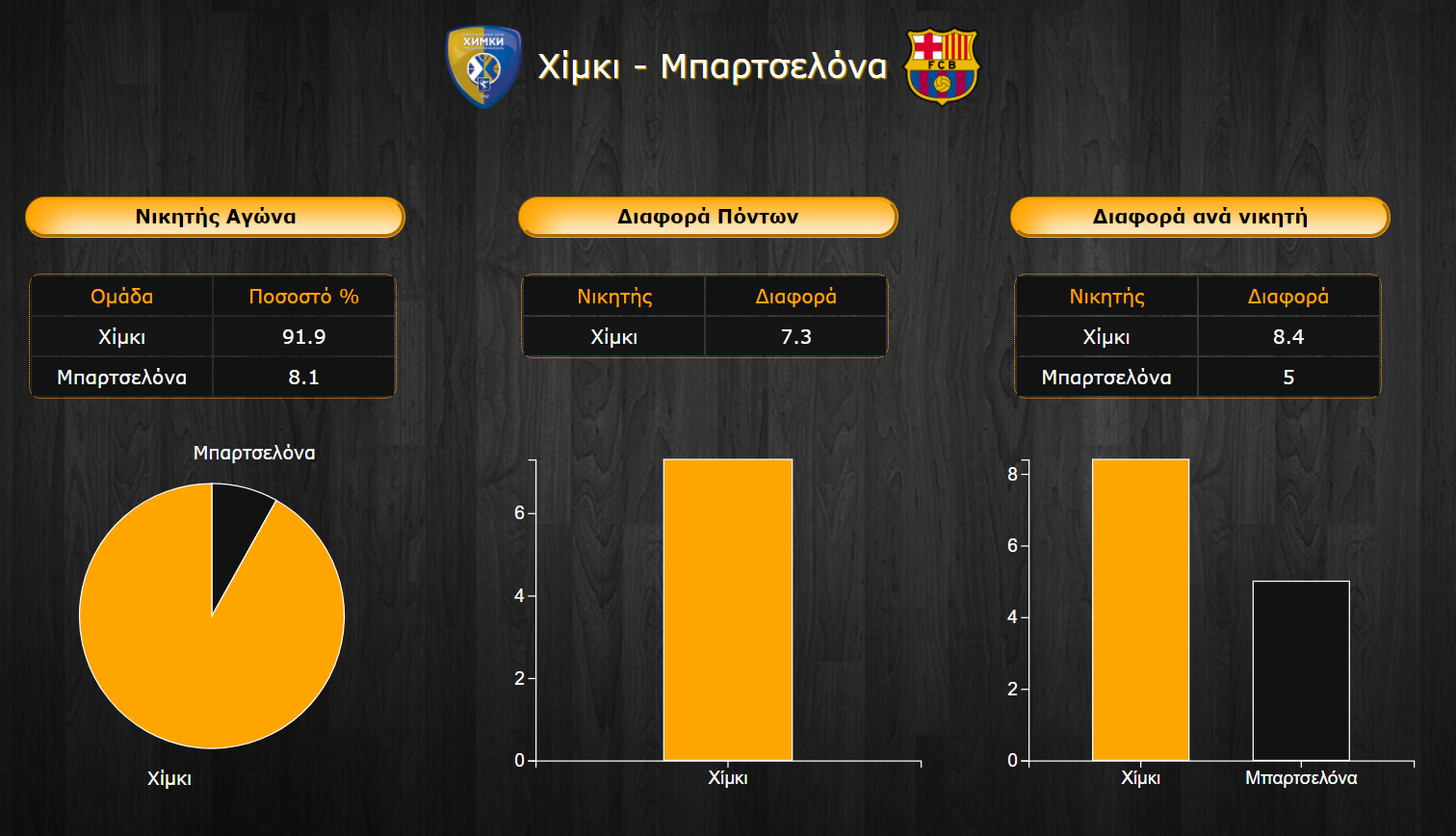 Μπορεί η Χίμκι να έχει διπλάσιες νίκες από την Μπαρτσελόνα στην Euroleague, παρ’ όλα αυτά οι Καταλανοί καταγράφουν όσο περίεργο κι αν φαίνετα,ι υψηλότερο ranking με 91,1 έναντι 84 καθώς σκοράρουν 80,9 πόντους κατά μέσο όρο, περισσότερους δηλαδή από τους 78,2 που συγκεντρώνουν οι Ρώσοι. Παράλληλα, προηγούνται ελαφρώς σε ποσοστά τόσο επιθετικά όσο και αμυντικά των αντιπάλων τους όπως και στα ριμπάουντ με 35,6 κατά μέσο όρο έναντι 32,8 των παικτών της ομάδας της Μόσχας.