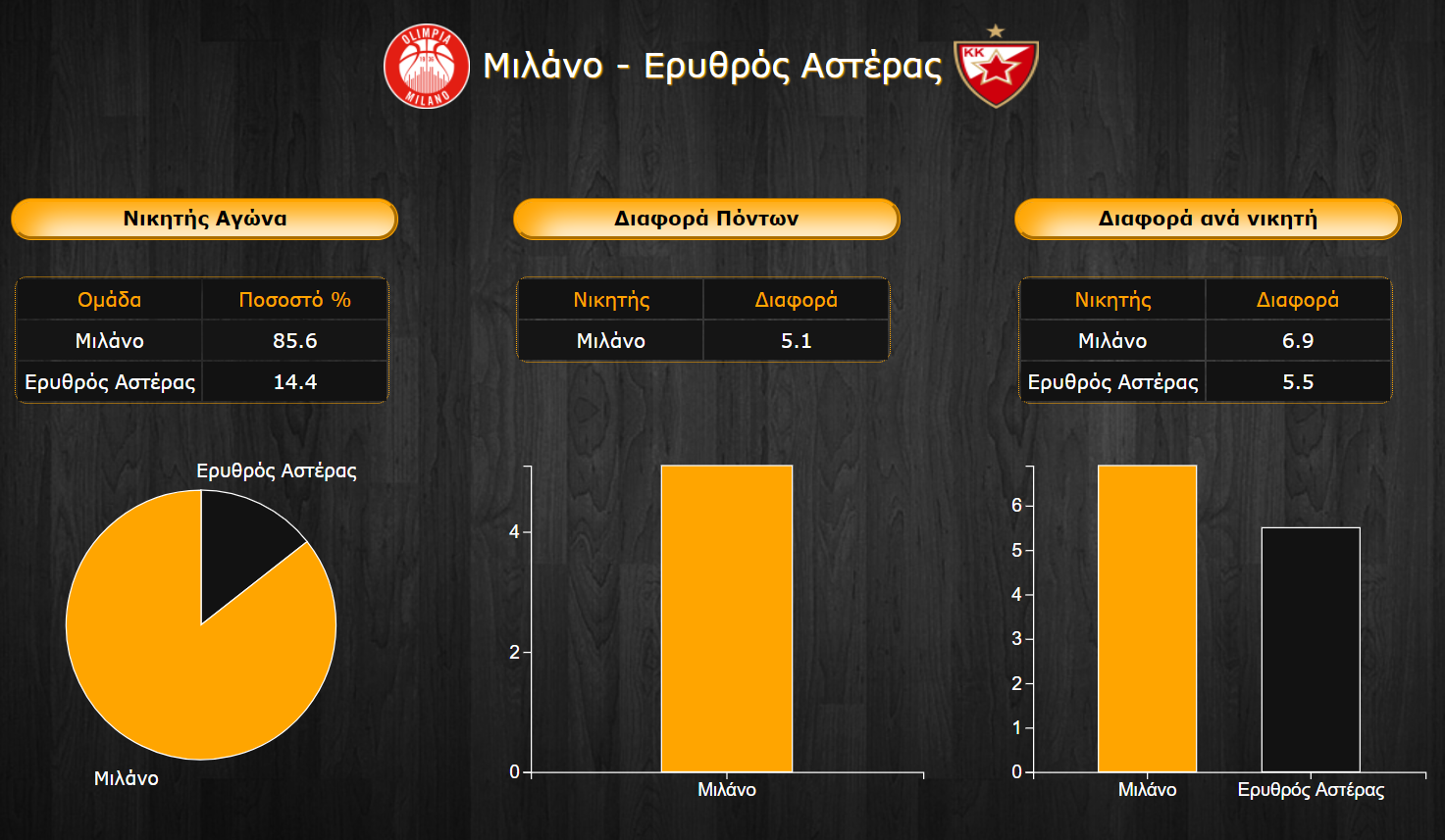 Η Αρμάνι Μιλάνο σκοράρει 78,6 πόντους, περισσότερους από την ομάδα του Αστέρα, έχοντας όμως χειρότερη άμυνα. Το παθητικό των 83,4 πόντων της ιταλικής ομάδας μοιάζει απαγορευτικό για κάτι καλύτερο από την τρέχουσα βαθμολογική θέση της ομάδας του Simone Pianigiani.