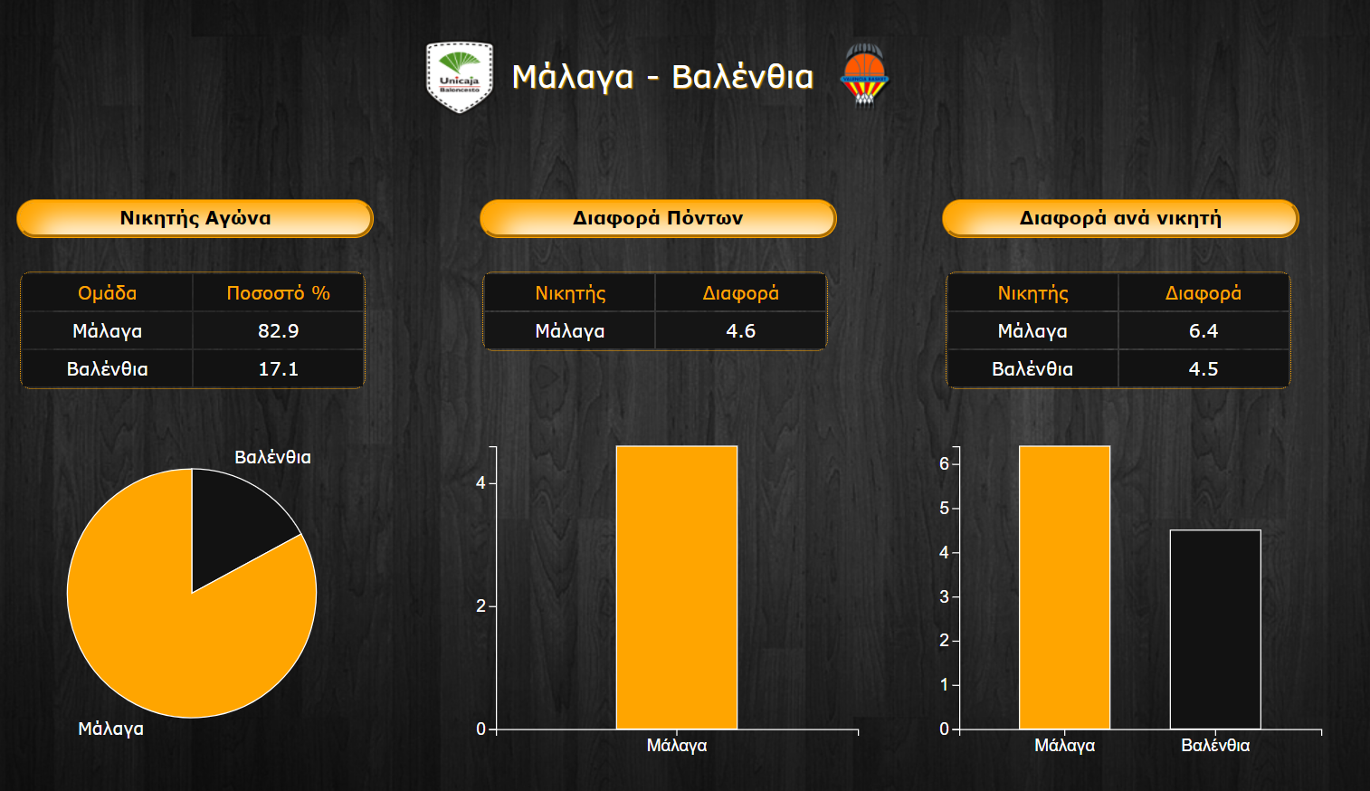 Οι δύο ομάδες είναι πολύ κοντά σε επίθεση και άμυνα με τη Μάλαγα να προηγείται οριακά με μόλις μισό πόντο περισσότερο κατά μέσο όρο, αλλά να υπολείπεται αμυντικά με 1,3 πόντους χειρότερο παθητικό. Η Μάλαγα όμως είναι η ομάδα που φαίνεται αισθητά πιο άστοχη ειδικά στα τρίποντα όπου σουτάρει με 35,1% έναντι 38,9% της πολύ επικίνδυνης περιφερειακά Βαλένθια, αλλά ακόμα και στις βολές καθώς η Μάλαγα είναι στο 68,2% από τη γραμμή της φιλανθρωπίας, ενώ η Βαλένθια είναι αξιόπιστη στη γραμμή του φάουλ με ποσοστό της τάξης του 83,1%.