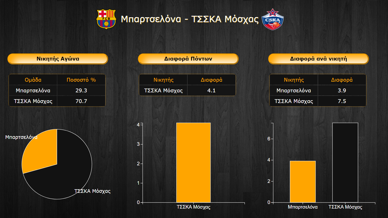 Αρκετά αμφίρροπη η αναμέτρηση στην Βαρκελώνη, με την πρώτη της βαθμολογίας ΤΣΣΚΑ του 12-3 βέβαια να παραμένει το φαβορί με ποσοστό 70,7%. Το 29,3% των γηπεδούχων από την άλλη μόνο αμελητέο δεν είναι και στηρίζεται στην πρόσφατη μεγάλη νίκη των Καταλανών επί της Χίμκι στην Μόσχα, αλλά και τα διάφορα, περιορισμένα αλλά εντυπωσιακά δείγματα της ομάδας του Σίτο Αλόνσο στο Παλάου Μπλαουγκράνα, θύματα των οποίων έπεσαν οι ελληνικές ομάδες στον πρώτο γύρο της κανονικής περιόδου.