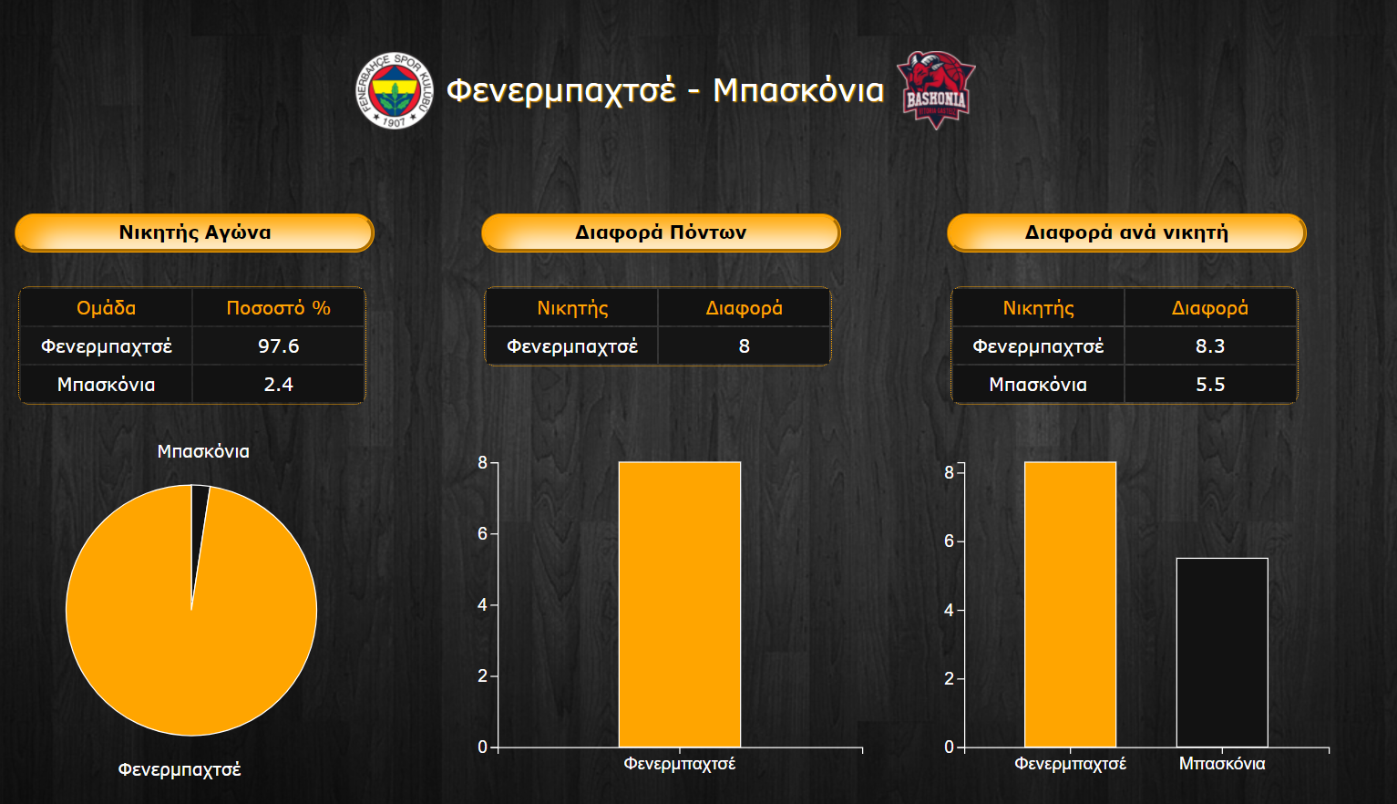 Περιθώρια για νέες απώλειες δεν υπάρχουν για την Φενερμπαχτσέ, αφού σε ενδεχόμενο νέας ήττας η ομάδα θα απομακρυνθεί από τις θέσεις του πλεονεκτήματος έδρας, ενώ θα βρίσκεται οριακά εντός των θέσεων που οδηγούν στα Playoffs. Έτσι, παρόλο που η Μπασκόνια παρουσιάζεται ιδιαίτερα ανταγωνιστική μετά από το κακό της ξεκίνημα, συγκεντρώνει ποσοστό μόλις 2,4%, έναντι του 97,6% της Φενέρ.