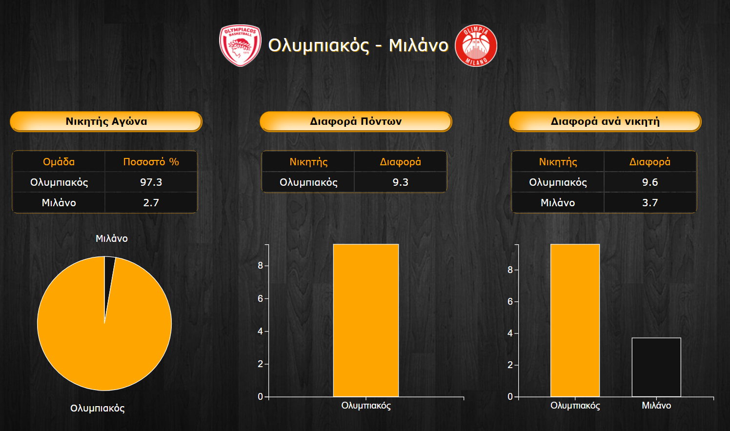 Ξεκάθαρο φαβορί της αναμέτρησης ο Ολυμπιακός με ποσοστό 97,3%, έναντι μόλις 2,7% της Μιλάνο. Προφανώς, η ποιότητα των δύο ομάδων, η έδρα, αλλά και η ...σοβαρότητα που έχουν επιδείξει στον πρώτο γύρο, γέρνουν συντριπτικά την πλάστιγγα υπέρ των γηπεδούχων, οι οποίοι μάλιστα αναμένεται να έχουν επιστροφές στο ρόστερ τους. Εύλογα, η επιμέρους διαφορά νίκης των ερυθρολεύκων είναι υψηλή και φτάνει τους 9,6 κατά μέσο όρο, ενώ σε περίπτωση έκπληξης από τους Ιταλούς, αυτή προφανώς προβλέπεται με μια σαφώς μικρότερη διαφορά, 3,7 πόντους. Έτσι, προκύπτει, βάσει των προβλέψεων, νίκη του Ολυμπιακού με μέση διαφορά τους 9,3 πόντους.