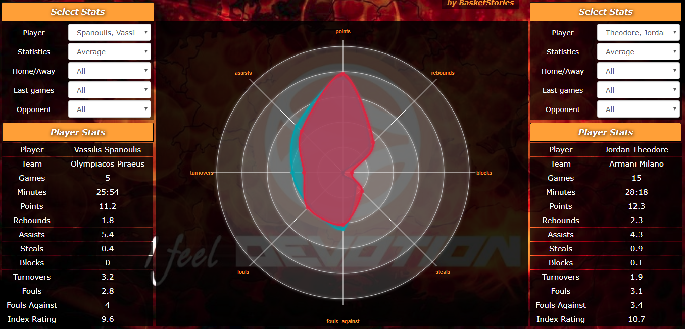 Οι δύο παίκτες που αποτελούν αδιαμφισβήτητα ο καθένας για την ομάδα του τον ιθύνοντα νου εντός του παρκέ. Ο αρχηγός του Ολυμπιακού Βασίλης Σπανούλης δείχνει και φέτος την μεγάλη του συμβολή στο παιχνίδι του Ολυμπιακού σημειώνοντας σε 26 περίπου λεπτά 11,2 πόντους και μοιράζοντας 5,4 ασίστ αποτελώντας τον «εγκέφαλο» της ομάδας. Τα λάθη παραμένουν διαχρονικό αγκάθι στο παιχνίδι του σπουδαίου Έλληνα γκαρντ που φτάνει φέτος τα 3,2 κατά μέσο όρο, κερδίζοντας παράλληλα 4 φάουλ. Όλα αυτά βέβαια σε ένα μικρό προς το παρόν δείγμα 5 αγώνων. Ο Jordan Theodore από την άλλη σε 28 λεπτά περίπου σκοράρει 12,3 πόντους με λιγότερες ασίστ (4,3), αλλά και λιγότερα λάθη (1,9) κερδίζοντας στα σημεία τη σύγκριση με 10,7 index rating έναντι 9,6 του εμβληματικού αρχηγού των ερυθρόλευκων.