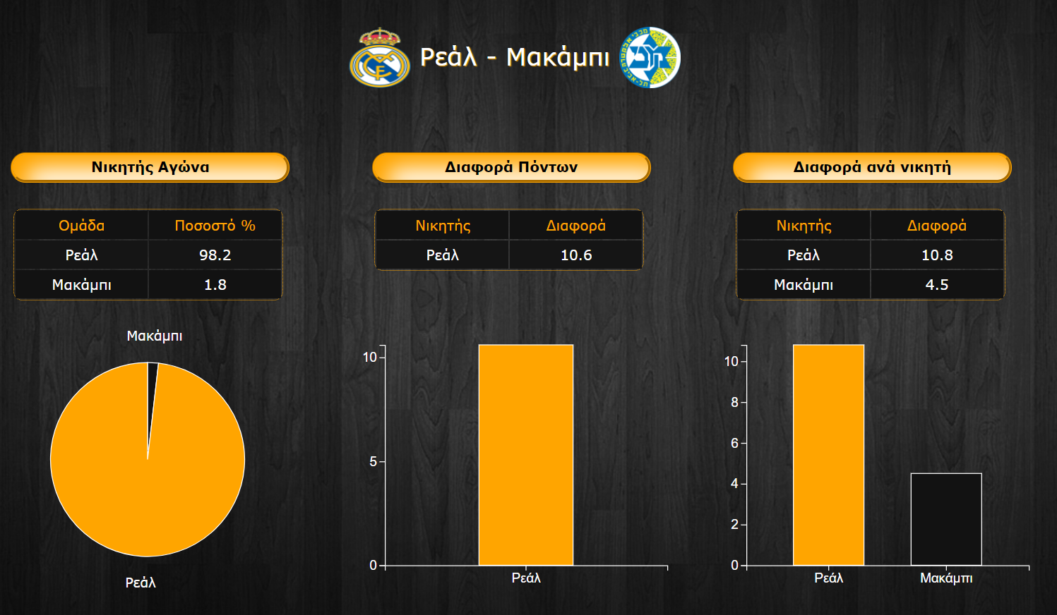 Κάπως έτσι, η μέση διαφορά νίκης για τη Ρεάλ φτάνει σε διψήφιο νούμερο και στους 10,8 πόντους, ενώ η αντίστοιχη της Μακάμπι στους 4,5 πόντους. Αθροιστικά λοιπόν, το σύνολο των παικτών του PickMaster Euroleague προβλέπει νίκη της ομάδας του Πάμπλο Λάσο με 10,6 πόντους μέση διαφορά.