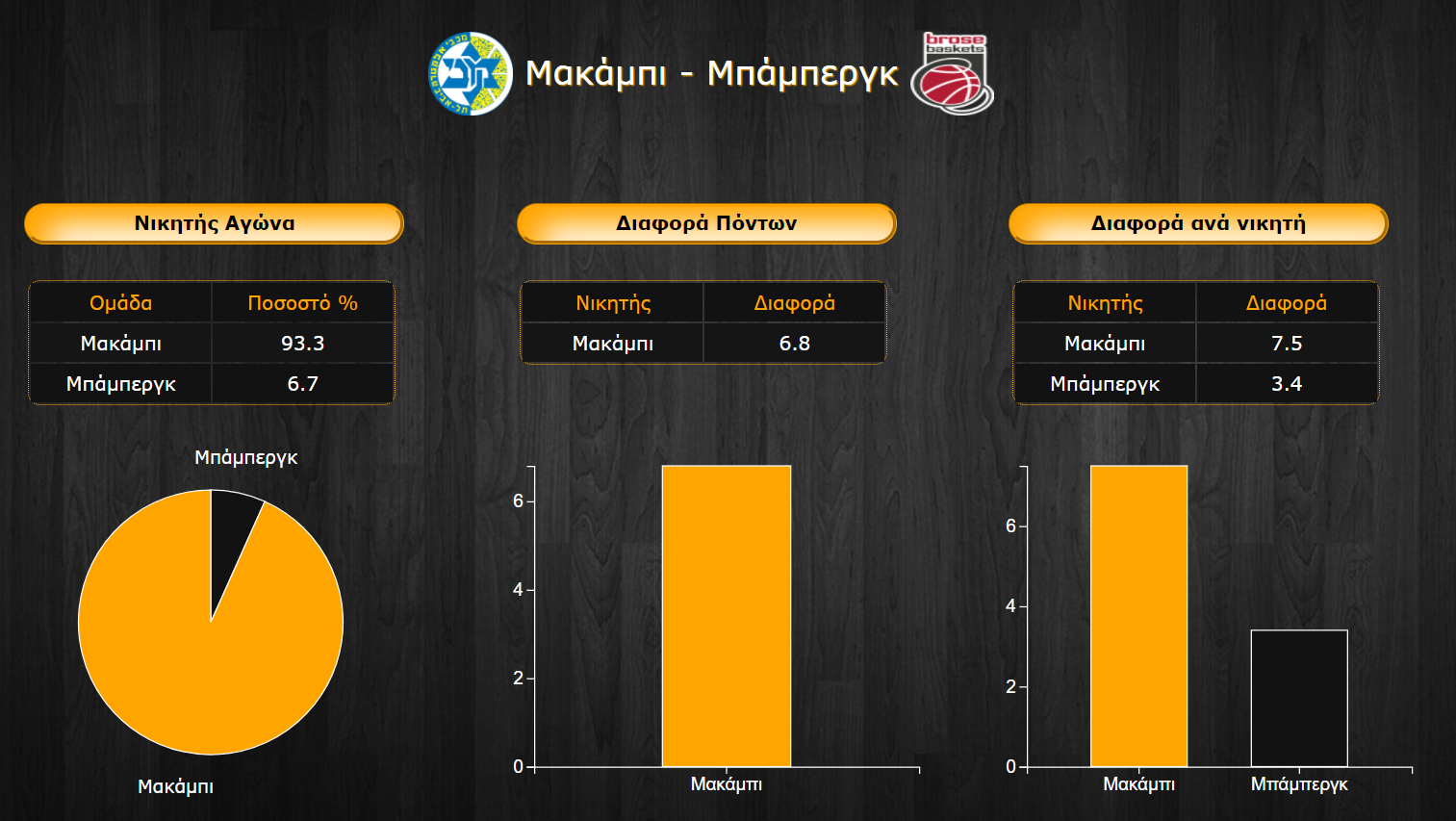 Εντός έδρας η Μακάμπι συνηθίζει να παρουσιάζει το καλό της πρόσωπο και οι περισσότεροι αντίπαλοι ...μένουν από καύσιμα στο φρενήρη ρυθμό της. Εύλογα λοιπόν θεωρείται το μεγάλο φαβορί της αναμέτρησης με ποσοστό 93,3%, έναντι 6,7% της Μπάμπεργκ, το οποίο βέβαια δεν είναι υποτυπώδες και "κρύβει" ουσιαστικά τον κίνδυνο που μπορεί να έχει η γερμανική ομάδα σε ένα καλό της βράδυ. Δεν είναι εξάλλου λίγες οι ανατροπές που έχει πετύχει τη φετινή σεζόν.