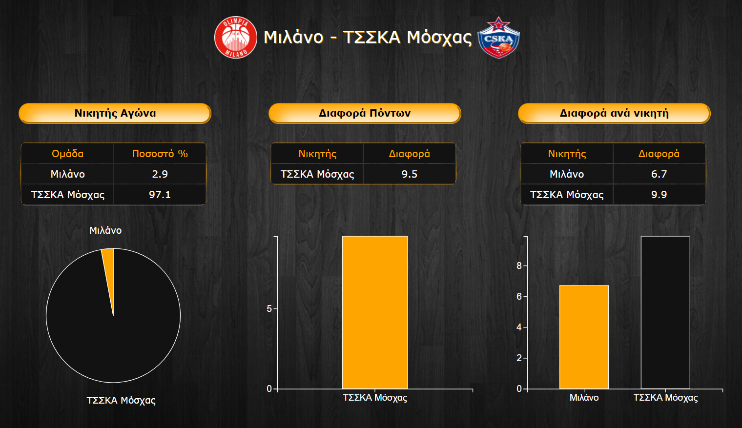 Όταν η πρώτη ομάδα της βαθμολογίας αναμετράται με την τελευταία, εύλογα θεωρείται το αδιαφιλονίκητο φαβορί της αναμέτρησης, ακόμα κι αν αγωνίζεται εκτός έδρας. Έτσι, το ποσοστό της ΤΣΣΚΑ ξεπερνά το 97%, τη στιγμή που για τη Μιλάνο ...περισσεύει μόλις το 2,9% των ψήφων, οι οποίες πάντως μπορούν να χαρακτηριστούν και ως αισιόδοξες, όχι τόσο ως προς το αποτέλεσμα, αλλά ως προς τη διαφορά νίκης της Μιλάνο που προβλέπουν, η οποία ανέρχεται στους 6,7 πόντους! Ίσως η μεταγραφή του Kuzminskas να παίζει το ρόλο της σ' αυτό. Όσο για το σύνολο του Δημήτρη Ιτούδη, το "δικό" της κοινό της δίνει νίκη με σχεδόν διψήφια διαφορά, 9,9 πόντους. Έτσι, από το σύνολο των παικτών του PickMaster Euroleague προκύπτει η διαφορά των 9,5 πόντων υπέρ της ΤΣΣΚΑ.