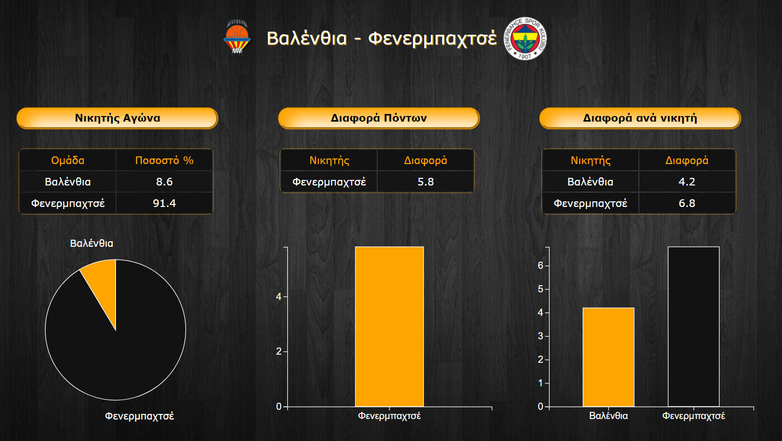 Η Φενερμπαχτσέ διαθέτει καλύτερη επίθεση, αλλά και άμυνα από τη Βαλένθια με 80,1 πόντους ενεργητικό και 74,1 παθητικό. Οι πρωταθλητές Ισπανίας σουτάρουν καλύτερα από την ομάδα της Κωνσταντινούπολης μόνο στις βολές με 83,4%, αλλά δεν υπολείπονται αισθητά σε σουτ εντός πεδιάς με 51,3% στα δίποντα και 39,3% στα τρίποντα. Η Βαλένθια διαθέτει αρκετούς ικανούς σουτέρ και επιδίδεται σε πολλά τρίποντα αναλογικά με δίποντα με τον δείκτη προσπαθειών για δύο προς τρεις να είναι από τους χαμηλότερους της λίγκας στο 1,4 έναντι 2 της Φενερμπαχτσέ.