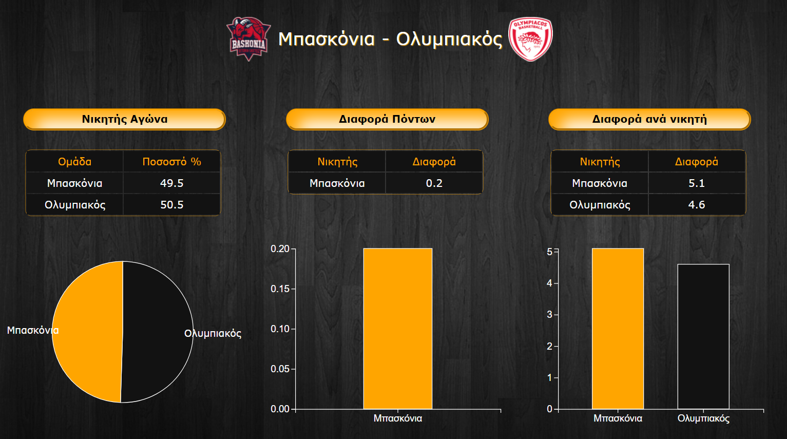 Σε κάθε περίπτωση αναμένεται ένα ιδιαίτερα αμφίρροπο και ανταγωνιστικό ματς, με τις επιμέρους διαφορές νίκης να μην "ξεφεύγουν" για καμιά από τις δύο ομάδες. Αυτή των Ισπανών ανέρχεται στους 5,1 πόντους, ενώ η ερυθρόλευκη επικράτηση φτάνει τους 4,6 πόντους. Έτσι, παρά το γεγονός ότι στο σύνολο των αποτελεσμάτων ο Ολυμπιακός είναι αυτός που υπερισχύει, έστω και για λίγο, όσον αφορά τις διαφορές, η Μπασκόνια θεωρείται το φαβορί της αναμέτρησης με +0,2 πόντους.