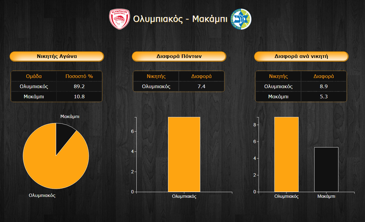 Οι επιθετικοί δείκτες των δύο ομάδων αναδεικνύουν νικήτρια τη Μακάμπι καθώς όπως βλέπουμε στον στατιστικό πίνακα, οι Ισραηλινοί σημειώνουν 80,4 πόντους κατά μέσο όρο, σχεδόν 5 περισσότερους ανά παιχνίδι από τον Ολυμπιακό με εξίσου μεγάλη διαφορά και στα ranking των δύο ομάδων (91,4 έναντι 82,4).