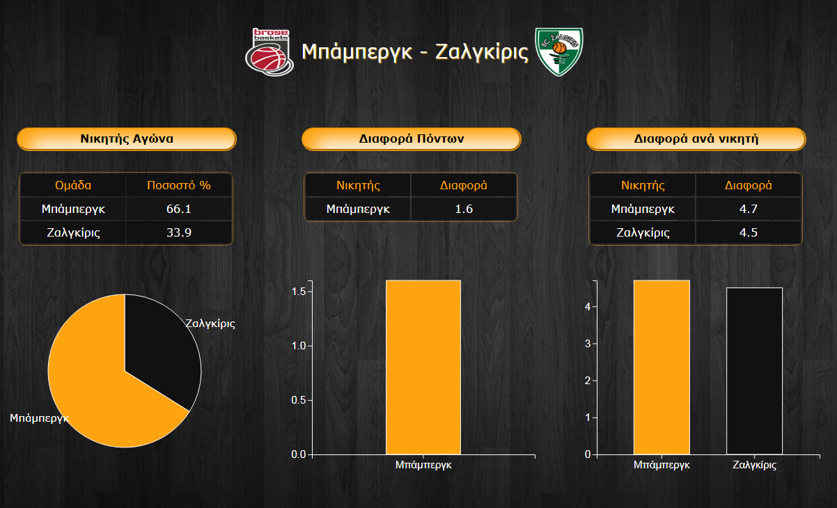 Φαβορί της αναμέτρησης και ξεκάθαρο μάλιστα αποτελεί η Μπάμπεργκ, με το ποσοστό νίκης της να είναι περίπου το διπλάσιο της Ζαλγκίρις και να ανέρχεται στο 66,1% έναντι του 33,9% των Λιθουανών. Οι δύο ομάδες προσέφεραν ένα ξεχωριστό παιχνίδι στον πρώτο γύρο και κάτι τέτοιο αναμένεται και τώρα με τις επιμέρους διαφορές νίκης τους να μην ξεπερνούν τους 5 πόντους, γεγονός αρκετά σπάνιο μέχρι στιγμής στο σύνολο των προβλέψεων. Έτσι, από τους +4,7 πόντους της Μπάμπεργκ και τους +4,5 πόντους Ζαλγκίρις, προκύπτουν οι 1,6 πόντοι διαφοράς υπέρ της ομάδας του Αντρέα Τρινκιέρι.