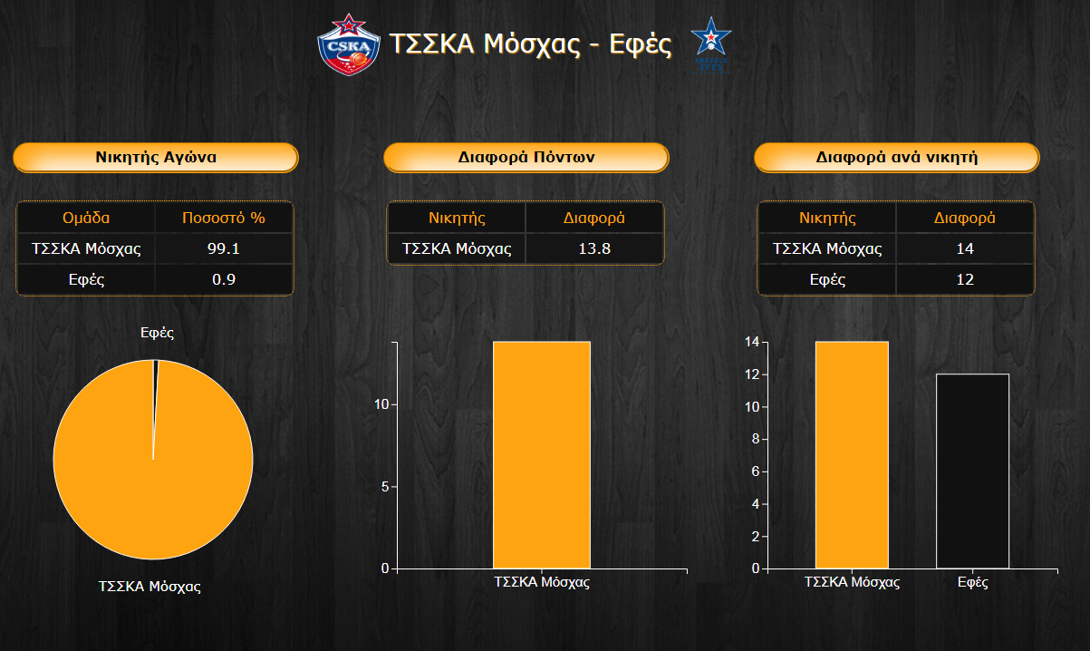 Το πιο ξεκάθαρο φαβορί από όλα τα παιχνίδια της αγωνιστικής είναι η ΤΣΣΚΑ, όπου συγκεντρώνει το υψηλότατο 99,1% νίκης απέναντι στην Εφές, η οποία δεν έχει δείξει σε κανένα σημείο της σεζόν έως τώρα ότι θα μπορούσε να κάνει μια τόσο μεγάλη έκπληξη. Προφανώς, αντίστοιχα μεγάλη είναι και η προβλεπόμενη διαφορά νίκης για τους Ρώσους που συνηθίζουν να πηγαίνουν σε υψηλό σκορ τα παιχνίδια τους, τη στιγμή που η Εφές δεν διαθέτει και τους καλύτερους αμυντικούς μηχανισμούς. Η μέση διαφορά νίκης για το σύνολο του Δημήτρη Ιτούδη ανέρχεται στους 13,8 πόντους.