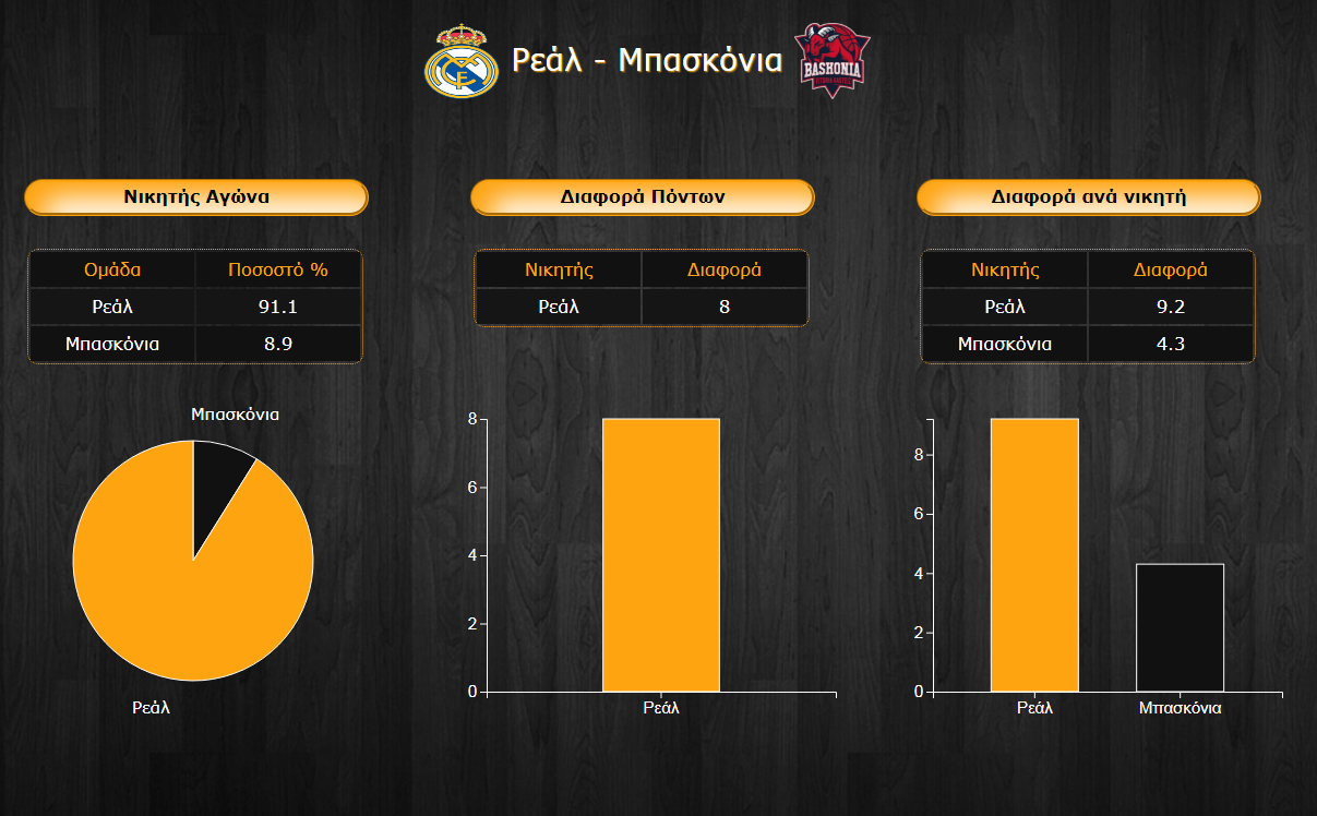 Ο φρενήρης ρυθμός της βασίλισσας αντικατοπτρίζεται και στο υψηλό 91,9% ποσοστό νίκης απέναντι στην επίσης επικίνδυνη Μπασκόνια, για την οποία ...περισσεύει το υπόλοιπο 8,9%, νούμερο πάντως που μόνο τυπικό δεν είναι και δείχνει ότι οι Βάσκοι μπορούν να αποδράσουν με ένα διπλό. Στο σενάριο αυτό βέβαια, η διαφορά νίκης τους αναμένεται να είναι σαφώς μικρότερη από της Ρεάλ, με την πιθανή νίκη των φιλοξενούμενων να ανέρχεται στους 4,3 πόντους και αυτή των γηπεδούχων στους 9,2. Έτσι, προκύπτει η μέση διαφορά των 8 πόντων υπέρ της ομάδας του Πάμπλο Λάσο.