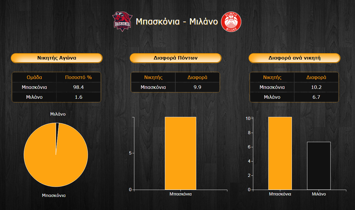 Αδιαφιλονίκητο φαβαρί της αναμέτρησης η Μπασκόνια με ποσοστό 98,4%, κάτι λογικό με τις εντυπωσιακές εμφανίσεις που πραγματοποιεί εντός έδρας. Αντίθετα, το ποσοστό της Μιλάνο, 1,6%, δεν μαρτυρά ουσιαστικές ελπίδες έκπληξης. Οι επιμέρους διαφορές είναι και στις δύο περιπτώσεις μεγάλες, με αυτή των γηπεδούχων να ανέρχεται σε διψήφια επίπεδα (10,2 πόντους), ενώ και αυτή των Ιταλών να φτάνει το υψηλό για τα δεδομένα των προβλέψεων νούμερο των 6,7 πόντων, δείγμα ότι αναμένουμε ένα ματς με υψηλό σκορ. Η τελική μέση συνολική διαφορά πρόβλεψης ανέρχεται στους 9,9 πόντους υπέρ των Βάσκων.