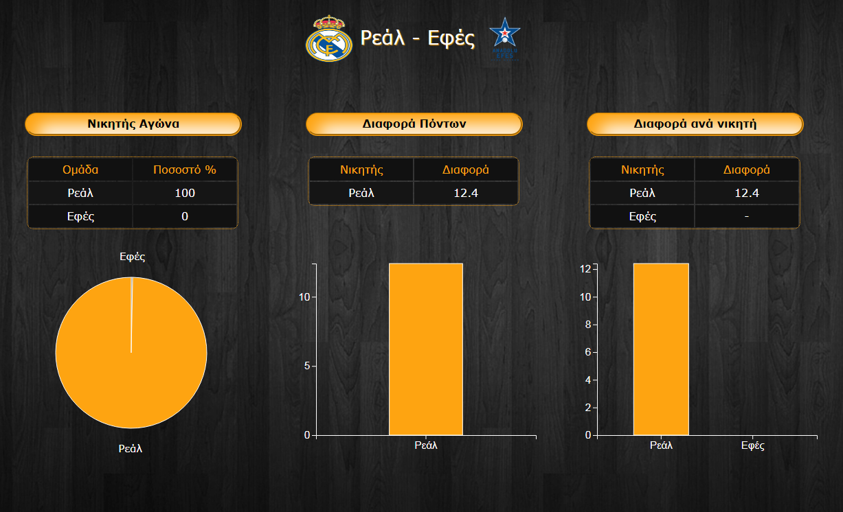 Η Ρεάλ δεν συγκρίνεται σε κανέναν τομέα σχεδόν με την Εφές και αυτό απεικονίζεται τόσο στις 16 μονάδες διαφοράς στο ranking (100,1 έναντι 84,2), στους 7 περισσότερους πόντους στην επίθεση (85,1 έναντι 78,1), αλλά και την καλύτερη άμυνα που διαθέτει από τους Τούρκους που δέχονται από τους αντιπάλους τους 83,6 πόντους κατά μέσο όρο.