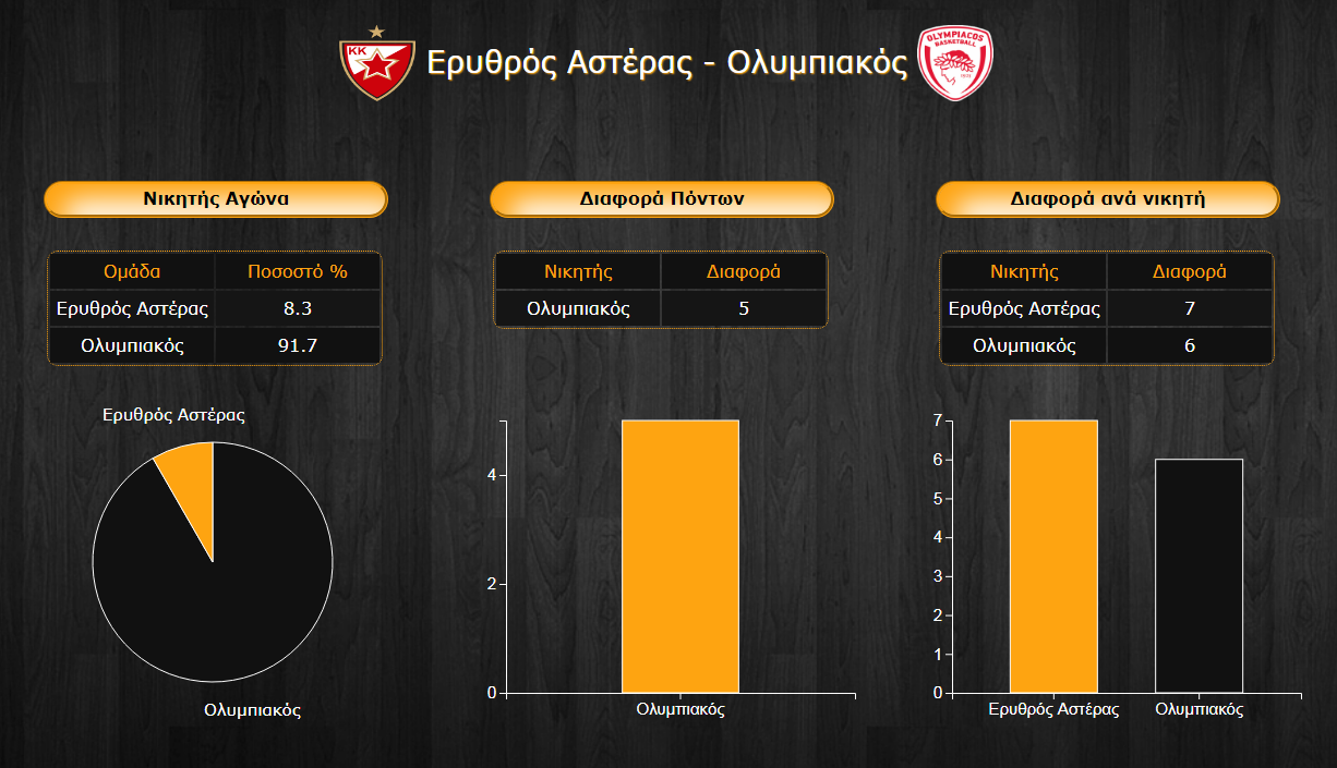 Οι ερυθρόλευκοι του Πειραιά κάνουν τη διαφορά στην αναμέτρηση όχι λόγω της επίθεσης που είναι σε χαμηλά επίπεδα (με μόλις 75 πόντους κατά μέσο όρο έναντι 77,1 του Ερυθρού Αστέρα), αλλά της άμυνας. Η ομάδα του Γιάννη Σφαιρόπουλου διαθέτει ένα παθητικό των 73,5 πόντων ανά αγώνα σε αντίθεση με τους Σέρβους που δεν παίζουν εξίσου καλή άμυνα και δέχονται 82,1 πόντους κατά μέσο όρο. Ασφαλώς, οι δύο τελευταίες εκτός έδρας αναμετρήσεις των Πειραιωτών δεν το απέδειξαν και οι παίκτες του Ολυμπιακού θα πρέπει να είναι ακόμα πιο συγκεντρωμένοι για να θυμηθούν τον καλό τους εαυτό.