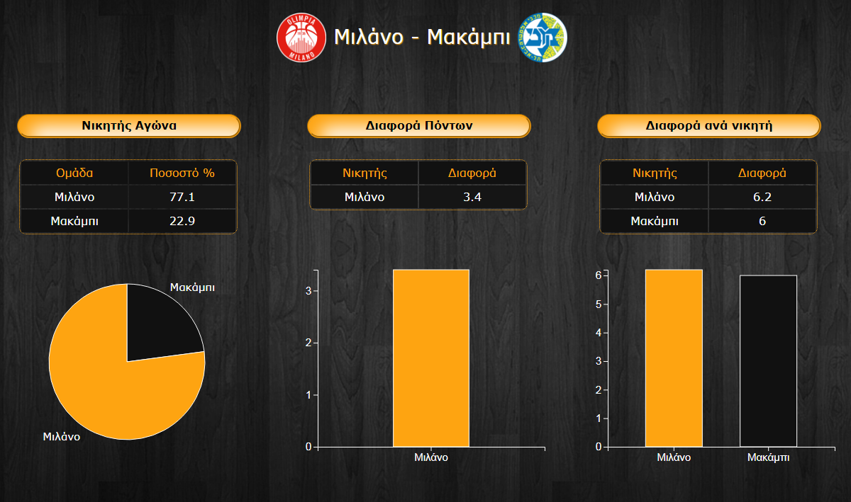 Οι δύο πρόσφατες νίκες της Μιλάνο φαίνεται να αλλάζουν τα δεδομένα στο PickMaster Euroleague, αφού η ομάδα του Σιμόνε Πιανιτζιάνι θεωρείται το μεγάλο φαβορί στην αναμέτρηση με την Μακάμπι με ποσοστό 77,1%, έναντι 22,9% της Μακάμπι, νούμερο πάντως που μόνο τυπικό δεν είναι και δείχνει τις φιλοδοξίες των Ισραηλινών για το παιχνίδι. Οι επιμέρους διαφορές νίκης των δύο ομάδων κυμαίνονται στα ίδια επίπεδα, περί τους 6 πόντους κι έτσι η τελική διαφορά του αγώνα προβλέπεται, ως μέση τιμή, στους 3,4 πόντους υπέρ των γηπεδούχων.