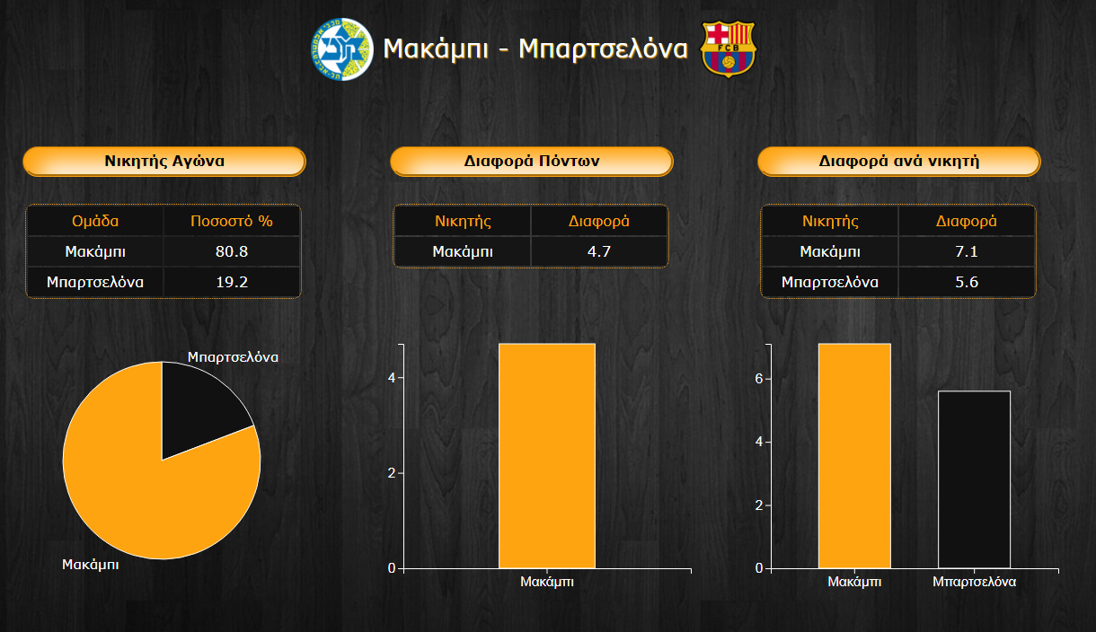 Η Μακάμπι όσο κι αν φαίνεται περίεργο δεν υπερτερεί της Μπαρτσελόνα σε πολλές από τις κατηγορίες της στατιστικής παρότι οι πορείες των δύο ομάδων φέτος αποδεικνύονται εκ διαμέτρου αντίθετες. Οι Καταλανοί πλέον νιώθοντας ότι δεν έχουν τίποτα παραπάνω να χάσουν ίσως αποδειχθούν πιο επικίνδυνοι παρότι το κλίμα παραμένει βαρύ στη Βαρκελώνη.