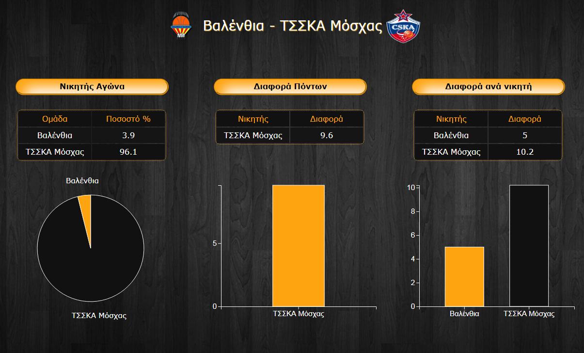 Η σύγκριση των δύο ομάδων δεν χωράει πολλά σχόλια καθώς η υπεροχή της ρωσικής αρκούδας είναι μεγάλη στις περισσότερες κατηγορίες. Οι Μοσχοβίτες σκοράρουν κοντά στους 90 πόντους ανά παιχνίδι διαθέτοντας μακράν την κορυφαία επίθεση της διοργάνωσης έναντι της απογοητευτικής Βαλένθια με μόλις 76,6 πόντους ανά αγώνα. Η συνολική διαφορά ενεργητικού παθητικού των δύο ομάδων είναι στο 14,3!