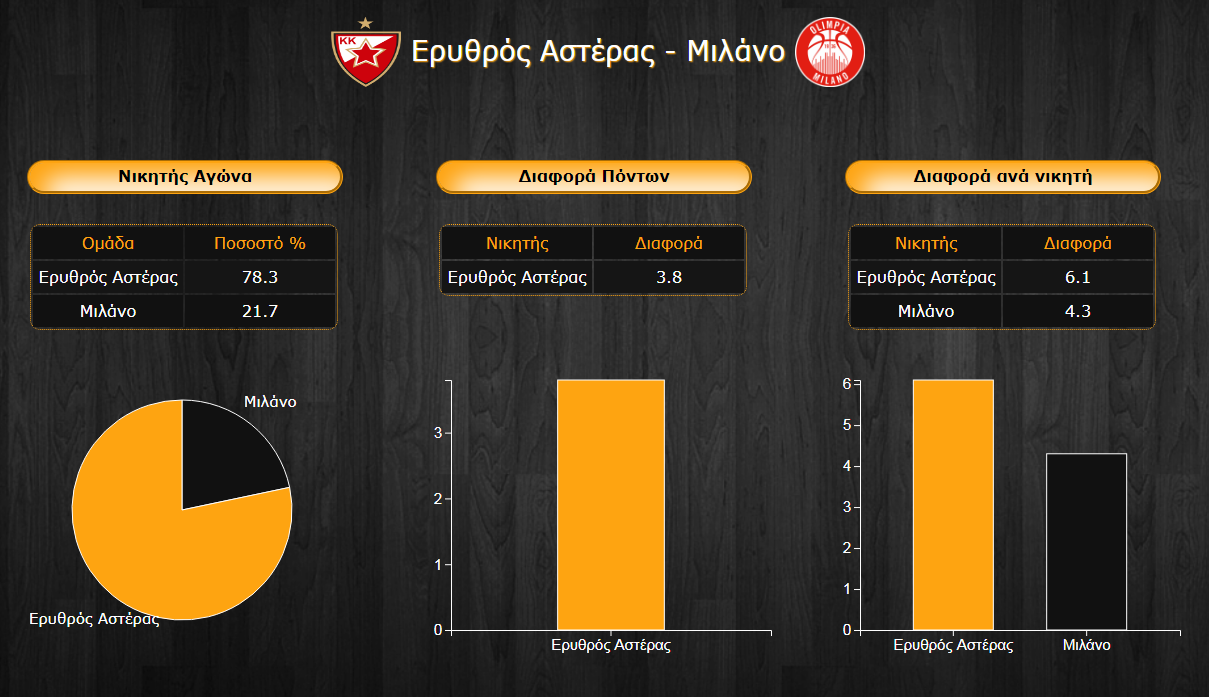 Ο Ερυθρός Αστέρας έχει τον πρώτο λόγο στην έδρα του, με ποσοστό 78,3%, έναντι του 21,7% της Μιλάνο, που καθιστά τους Ιταλούς υπολογίσιμο και επικίνδυνο αντίπαλο, στην επικείμενη αναμέτρηση. Παρότι οι δύο ομάδες συνηθίζουν να παίζουν σε μεγάλα σκορ, οι επιμέρους διαφορές νίκης είναι μάλλον μικρές, κάτι που μαρτυρά και τον αμφίρροπο χαρακτήρα του ματς, με τους γηπεδούχους να έχουν μέση διαφορά νίκης τους 6,1 πόντους και τους φιλοξενούμενους τους 4,3. Έτσι, η μέση διαφορά του αγώνα από το σύνολο των μέχρι τώρα ψήφων διαμορφώνεται στους 3,8 πόντους υπέρ της ομάδας του Ερυθρού Αστέρα.