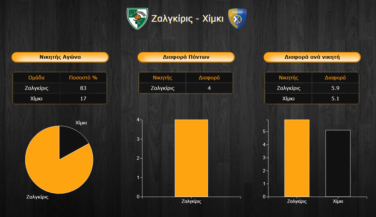 Η εικόνα της Ζαλγκίρις μέχρι τώρα είναι αρκετά πειστική για να "δικαιολογήσει" το υψηλό 83% για τη νίκη στην αναμέτρηση των δύο ομάδων, με το 17% της Χίμκι πάντως να δείχνει ότι δεν είναι και τόσο λίγοι αυτοί που θεωρούν ότι οι παίκτες του Γιώργου Μπαρτζώκα μπορούν να καταφέρουν ένα σπουδαίο διπλό. Σε κάθε περίπτωση, αναμένεται ένα αμφίρροπο ματς, με τις επιμέρους διαφορές νίκης των δύο ομάδων να ανέρχονται στους 5,9 πόντους για τους γηπεδούχους και στους 5,1 πόντους για τους φιλοξενούμενους και την τελική διαφορά να διαμορφώνεται στους 4 πόντους για το σύνολο του Γιασικεβίτσιους.