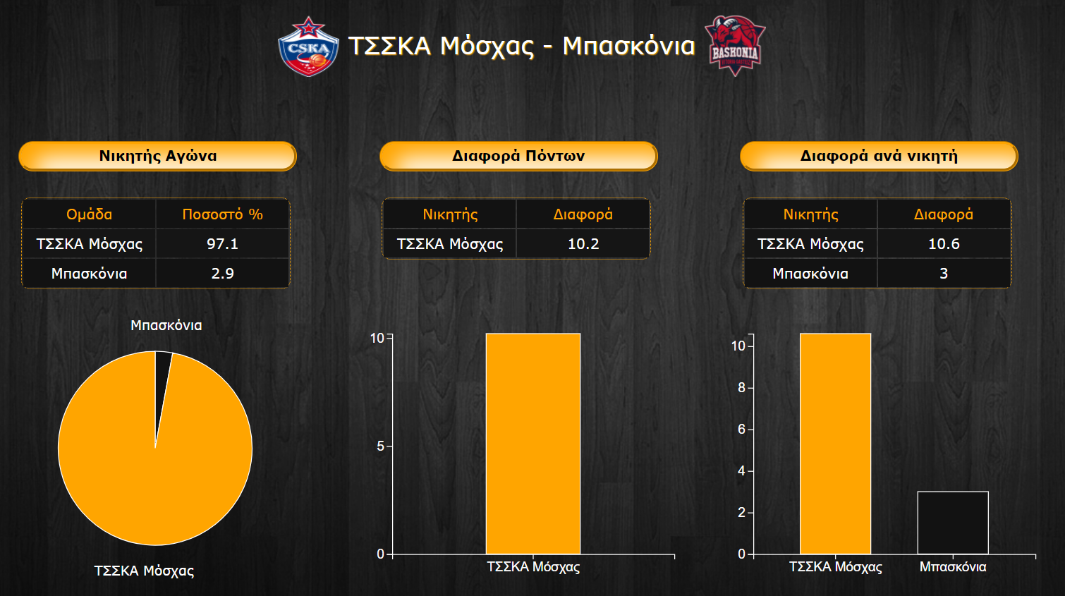 Η αναμέτρηση έχει ξεκάθαρο φαβορί κι αυτό δεν είναι άλλο, αναμφίβολα, από την ΤΣΣΚΑ, η οποία συγκεντρώνει ποσοστό νίκης 97,1%, έναντι μόλις 2,9% για την Μπασκόνια. Οι Μοσχοβίτες προβλέπεται να επικρατήσουν με διψήφια μέση διαφορά της τάξης των 10,6 πόντων, νούμερο που δεν "υποτιμά" απαραίτητα τους Βάσκους, αλλά πιθανώς συνυπολογίζει και το υψηλό σκορ που ενδεχομένως θα σημειωθεί στο παιχνίδι. Από την άλλη, μια ενδεχόμενη νίκη των φιλοξενουμένων αναμένεται να έρθει με σαφώς πιο δύσκολο τρόπο και μικρότερη διαφορά 3 πόντων. Έτσι, η συνολική διαφορά διαμορφώνεται στους 10,2 πόντους για τους πρωτοπόρους της βαθμολογίας.