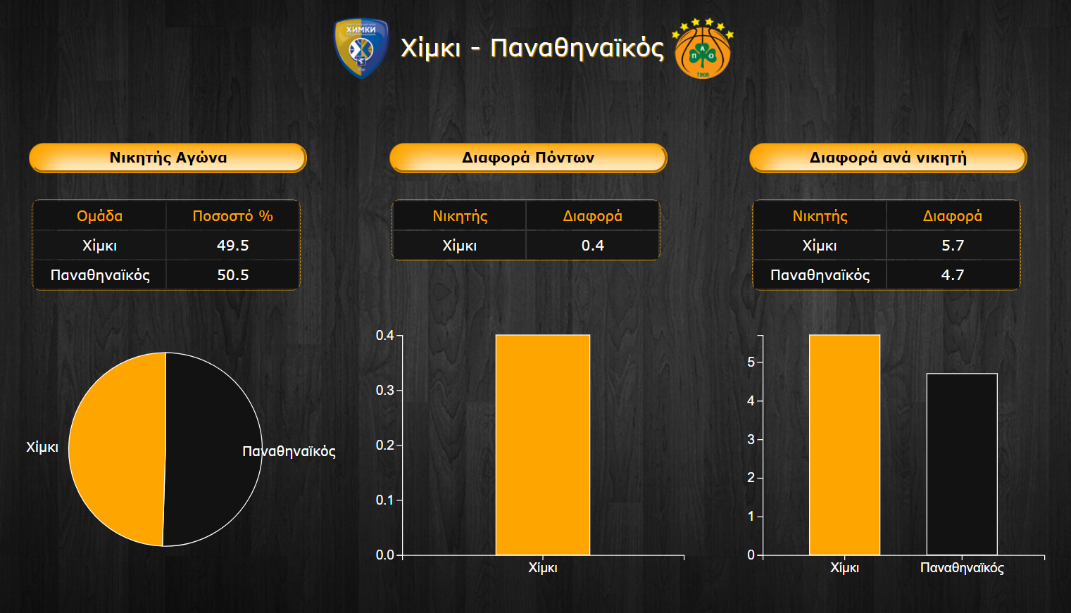 Πολύ μεγάλο ντέρμπι βάσει και των δικών σας προβλέψεων, με το ποσοστό της Χίμκι να ανέρχεται στο 49,5% και αυτό του Παναθηναϊκού στο 50,5%, νούμερο που δίνει οριακά, για την ώρα τουλάχιστον, το προβάδισμα στο τριφύλλι. Ωστόσο, η επιμέρους διαφορά νίκης για τους πράσινους είναι μικρότερη, 4,7 πόντοι, από αυτή των γηπεδούχων, που βρίσκεται έναν πόντο πάνω, στους 5,7. Έτσι, παρά το ελαφρύ προβάδισμα του Παναθηναϊκού στο ποσοστό νίκης, η τελική διαφορά πάει υπέρ της ομάδας του Γιώργου Μπαρτζώκα με 0,4 πόντους και έχει μεγάλο ενδιαφέρον να δούμε τα τελικά νούμερα, πριν την έναρξη της αγωνιστικής.