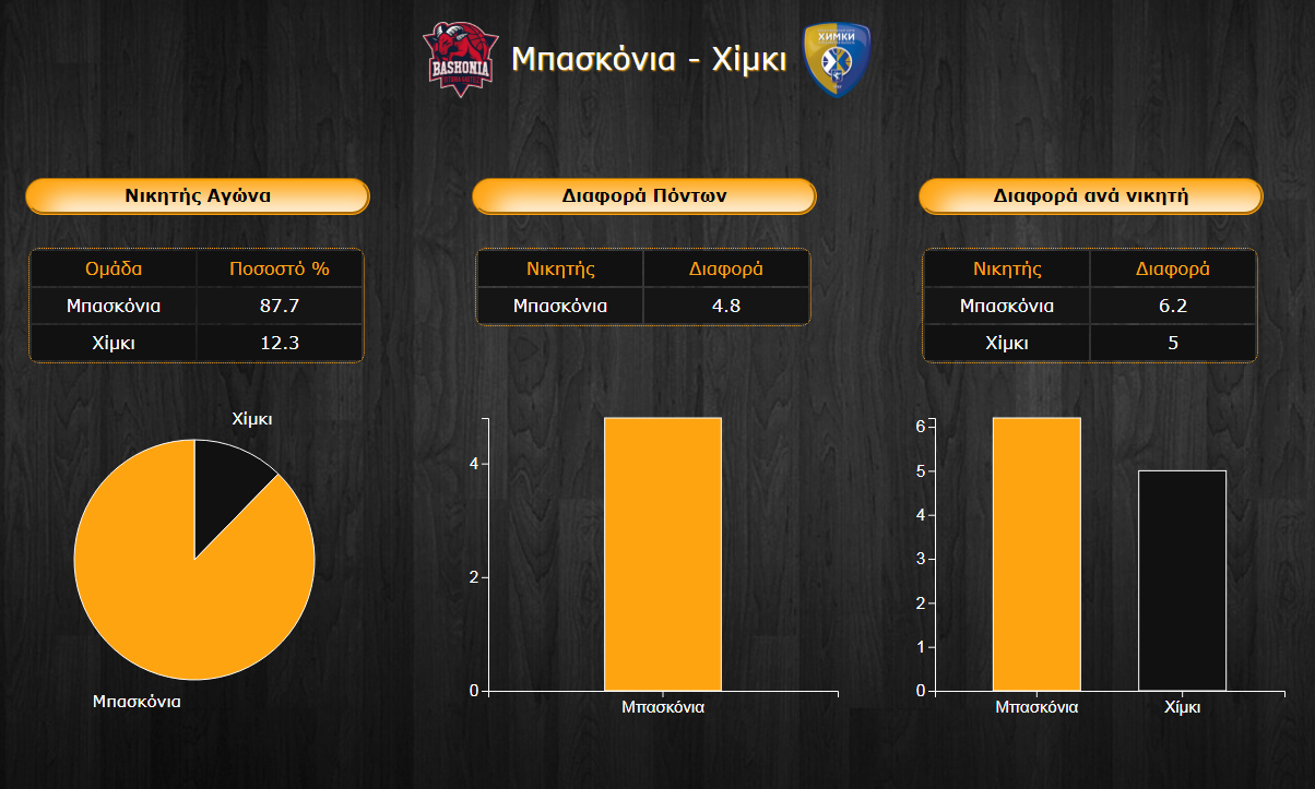 Η ομάδα του Γιώργου Μπαρτζώκα υπολείπεται σε ποσοστά τόσο στα δίποντα όπου σουτάρει με 52% έναντι 55% όσο και στα τρίποντα καθώς το 35,8% της ρωσικής ομάδας είναι σαφώς χαμηλότερο από την πιο επικίνδυνη περιφερειακά Μπασκόνια του 40,6% στα σουτ πίσω από τα 6,75μ. Η Χίμκι όμως είναι η ομάδα που επιχειρεί περισσότερες προσπάθειες για τρίποντο σε σχέση με τα δίποντα καθώς στον δείκτη διπόντων/τριπόντων είναι πολύ χαμηλά, μόλις στο 1,26 έναντι του 1,56 της ισπανικής ομάδας.