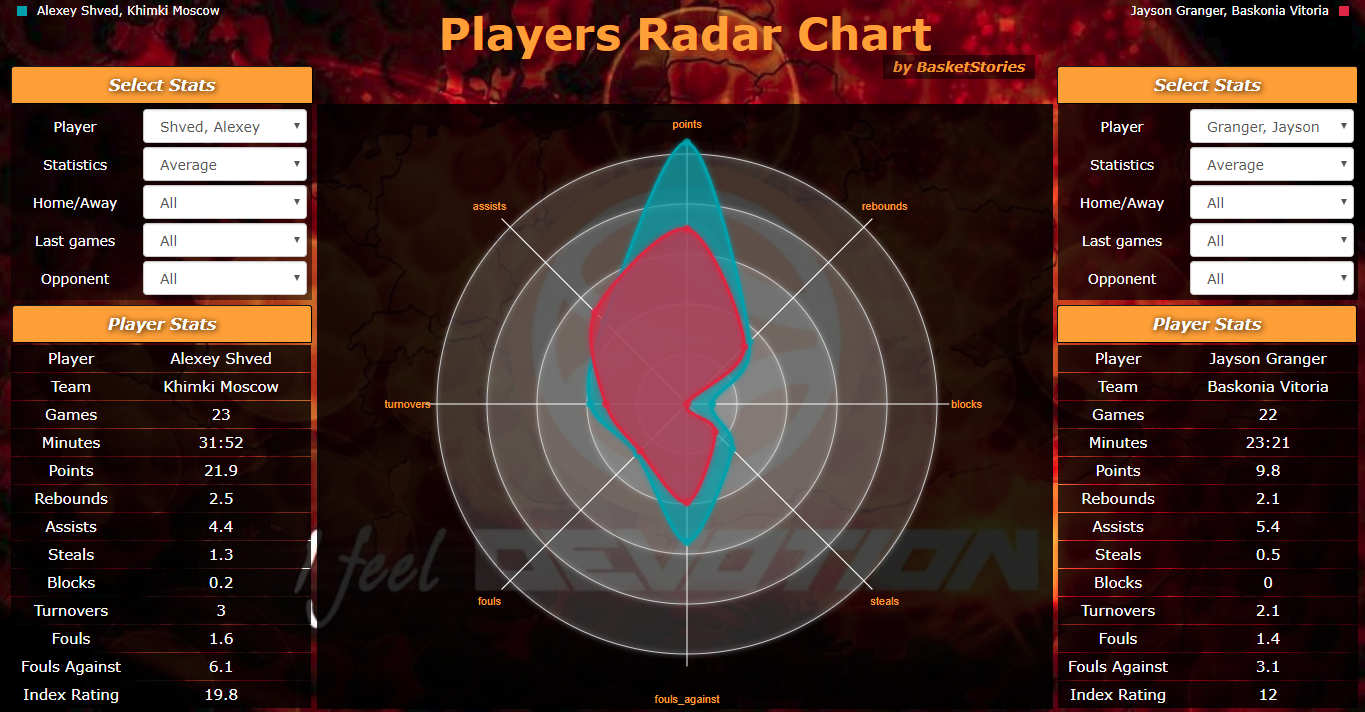 Στο ραντάρ του BasketStories οι δύο σημαντικότεροι γκαρντ για την Μπασκόνια και τη Χίμκι που αποτελούν βαρόμετρα με την απόδοση τους. Ο Alexey Shved είναι αναμφίβολα ένας από τους κορυφαίους γκαρντ της Ευρωλίγκας και το πρώτο φαβορί για το βραβείο του πρώτου σκόρερ. Ο MVP για το μήνα Φεβρουάριο σε περίπου 32' σκοράρει 21,9 πόντους ενώ ακόμα μοιράζει 44 ασίστ, κλέβει 1,3 φορές την μπάλα ανά παιχνίδι και κερδίζει 6,1 φάουλ ανά αγώνα έχοντας όμως και 3 λάθη κατά μέσο όρο. Από την άλλη πλευρά, είναι σίγουρα άδικο για τον Granger να συγκρίνουμε βάσει αριθμών παραβλέποντας και τον χρόνο καθώς ο Ουρουγουανός γκαρντ των Βάσκων αγωνίζεται για λιγότερο από 23,5 λεπτά κατά μέσο όρο με 9,8 πόντους, 2,1 ριμπάουντ και 5,4 ασίστ που είανι και ο μόνος τομέας που τα πηγαίνει καλύτερα όπως φυσικά και στα λάθη. Το 19,8 του Shved σε index rating είναι ασυναγώνιστο για οποιονδήποτε περιφερειακό της Μπασκόνια.