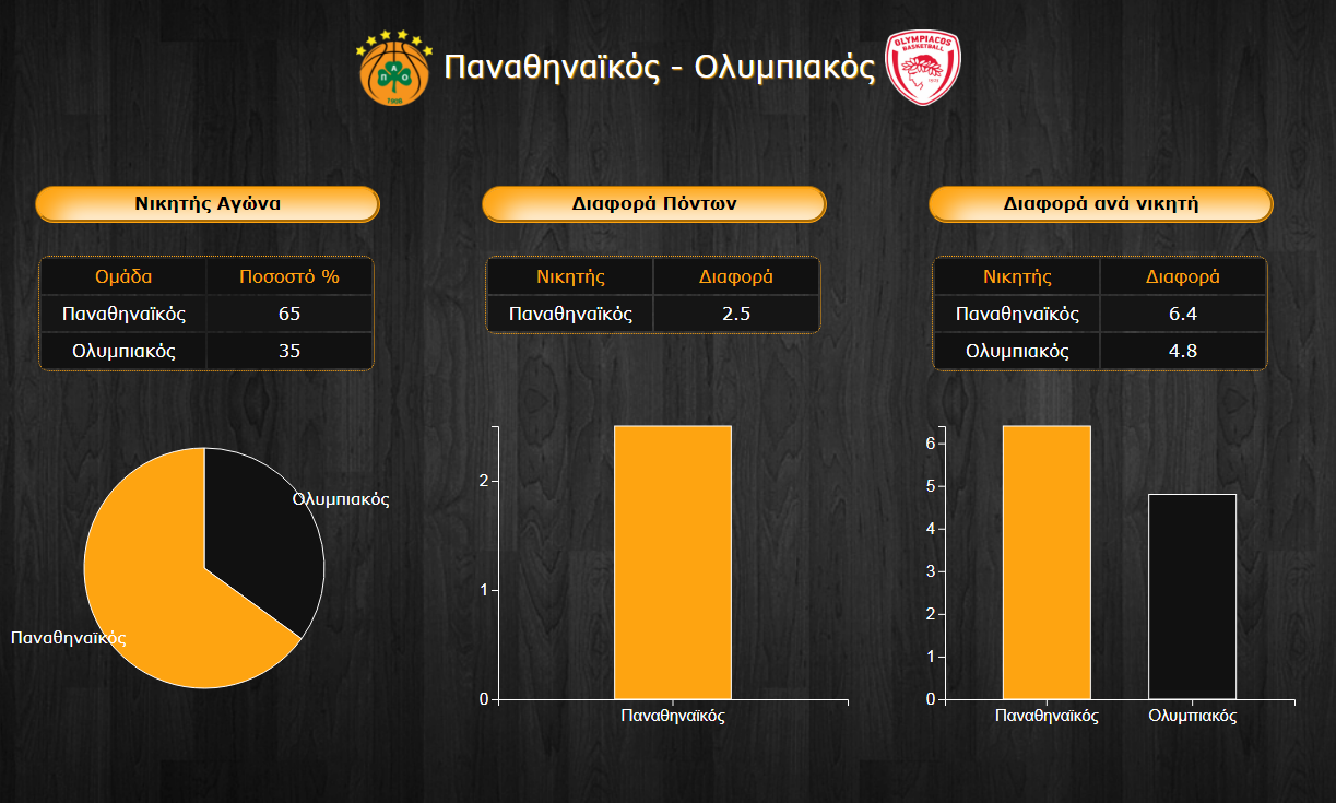 Σπουδαίο ντέρμπι αναμένεται στο Νίκος Γκάλης με τα ποσοστά των δύο ομάδων να δίνουν ένα προβάδισμα στο γηπεδούχο Παναθηναϊκό, που είναι μεν αξιοσημείωτο, καθώς η πρόβλεψη νίκης των πρασίνων φτάνει στο 65%, ωστόσο δείχνει και τη δυναμική του Ολυμπιακού που παρά τα όποια σκαμπανεβάσματα στην απόδοσή του, είναι ικανός να διεκδικήσει και να φύγει με τη σειρά του με το ροζ φύλλο αγώνα με ποσοστό 35%. Η ομάδα του Τσάβι Πασκουάλ στο σενάριο που κερδίσει τον αγώνα αναμένεται να το κάνει σχετικά πιο εύκολα από τον Ολυμπιακού, αφού η επιμέρους διαφορά νίκης της ανέρχεται στους 6,4 πόντους, έναντι 4,8 των ερυθρολεύκων. Οι μικρές αυτές τιμές βέβαια μαρτυρούν και το χαρακτήρα του ντέρμπι μεταξύ των δύο ομάδων. Από το σύνολο των έως τώρα ψήφων λοιπόν, προκύπτει νίκη του Παναθηναϊκού με μέση διαφορά 2,5 πόντων.