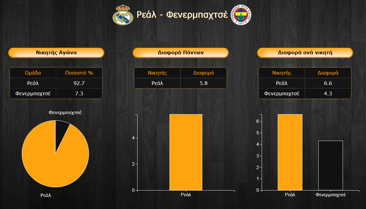 Η Ρεάλ Μαδρίτης τρέχει με... 100 όπως αποδεικνύει και το 100,9 στο ομαδικό της ranking. Οι Μαδριλένοι προηγούνται στην επίθεση με 85,2 πόντους κατά μέσο όρο έναντι 80 των Τούρκων. Η πρωταθλήτρια Ευρώπης έχει πιο συμπαγή άμυνα όμως με μόλις 74,5 πόντους παθητικό έναντι 78,9 των Ισπανών.