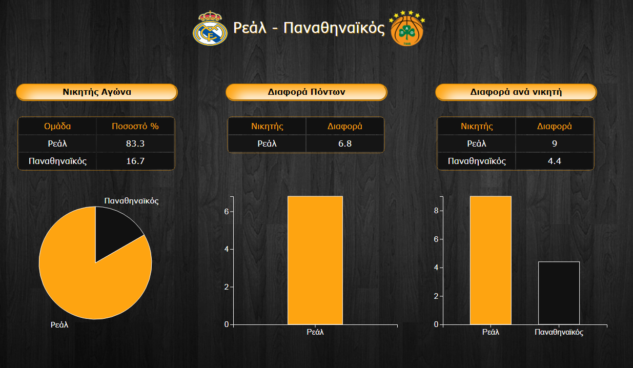 Το φαβορί της αναμέτρησης στη Μαδρίτη είναι η Ρεάλ, με 5 στους 6 παίκτες του PickMaster (ποσοστό 83,3%) μέχρι τώρα να θεωρούν ότι εύκολα ή δύσκολα η "βασίλισσα" θα πάρει το ροζ φύλλο αγώνα, ενώ το 16,7% πιστεύει ότι οι πράσινοι μπορούν να αποδράσουν με το ροζ φύλλο αγώνα. Στο σενάριο αυτό βέβαια, η ελληνική ομάδα αναμένεται να νικήσει σε ένα πιο κλειστό ματς, με τη μέση διαφορά επικράτησης της ομάδας του Τσάβι Πασκουάλ να ανέρχεται στους 4,4 πόντους, ενώ αντίστοιχα οι γηπεδούχοι, έχοντας υπέρ τους το πιο γρήγορο τέμπο, αλλά και ένα σχετικά καλύτερο μομέντουμ μετά και τις επιστροφές των παικτών έχουν μέση διαφορά νίκης στους 9 πόντους. Από το σύνολο των ψήφων μέχρι στιγμής λοιπόν, προκύπτει νίκη για το σύνολο του Πάμπλο Λάσο με μέση διαφορά τους 6,8 πόντους.