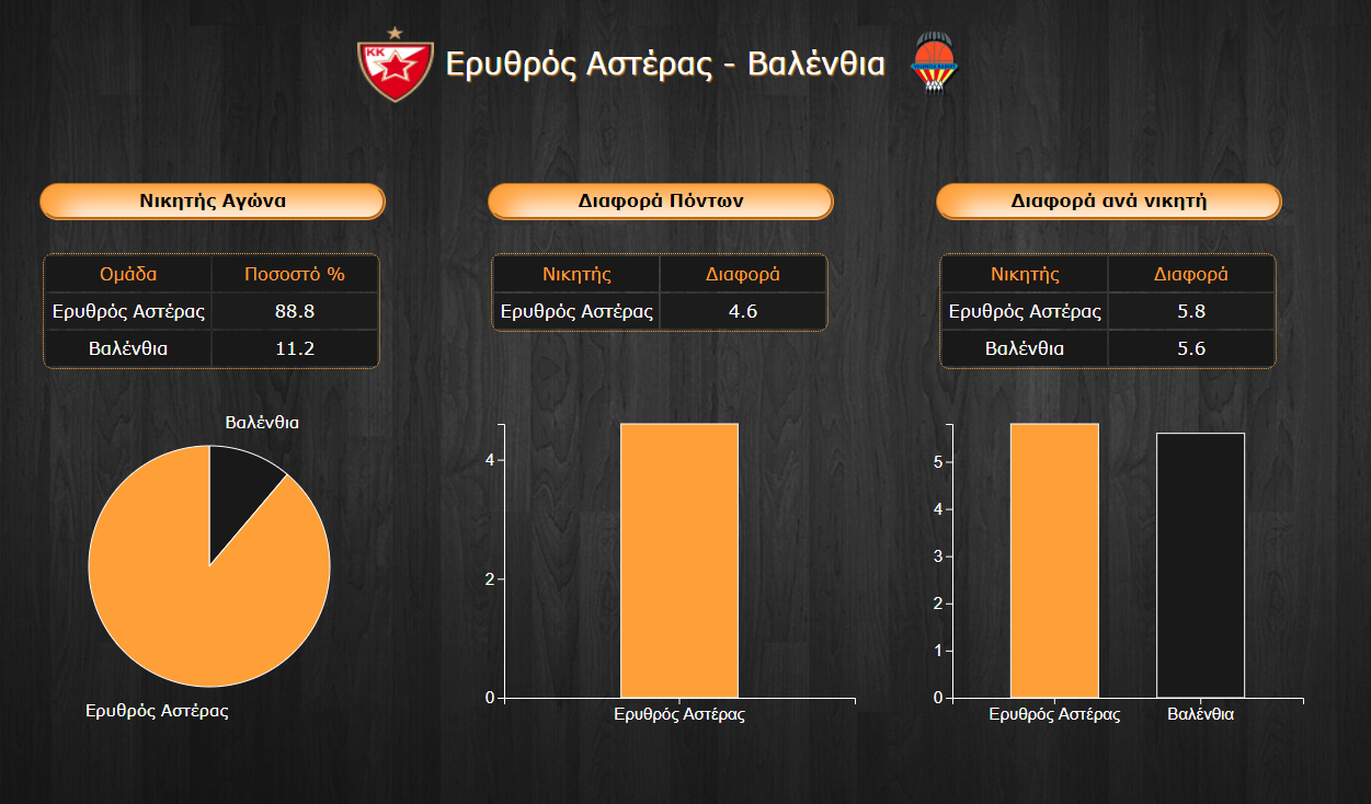 - Η Βαλένθια σουτάρει με μεγαλύτερη αποτελεσματικότητα σε τομείς όπως οι ελεύθερες βολές με 83% έναντι 74,5% των Σέρβων, αλλά και στα τρίποντα καθώς οι "νυχτερίδες" είναι καλύτερες πίσω από τη γραμμή των 6,75μ. με 38,8% έναντι 33,7% των Σέρβων.