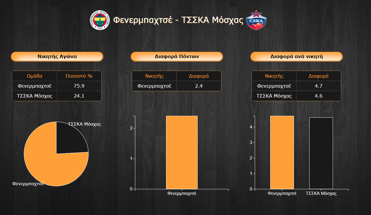 Το διπλό της Φενερμπαχτσέ στον πρώτο γύρο στη Μόσχα, αλλά και το σερί νικών των Τούρκων τις τελευταίες αγωνιστικές φαίνεται να ισχυροποιούν την ομάδα του Zeljko Obradovic στις προβλέψεις του PickMaster. Το 75,9% στηρίζει τον άσσο των γηπεδούχων ενώ το 24,1% πιστεύει ότι σε ένα τέτοιο ντέρμπι κανείς δεν μπορεί να υποτιμήσει την κορυφαία κατά τεκμήριο ομάδα της regular season μέχρι τώρα. Η μέση διαφορά δεν ξεπερνά τους 2,4 πόντους επιβεβαιώνοντας ότι αναμένεται ένα δυνατό ντέρμπι, ενώ όσον αφορά ξεχωριστά τα προγνωστικά για την κάθε ομάδα, η μέση διαφορά είναι λίγο πάνω από τους 4,5 πόντους τόσο για την πρωταθλήτρια Ευρώπης όσο και για τη ρωσική ομάδα.