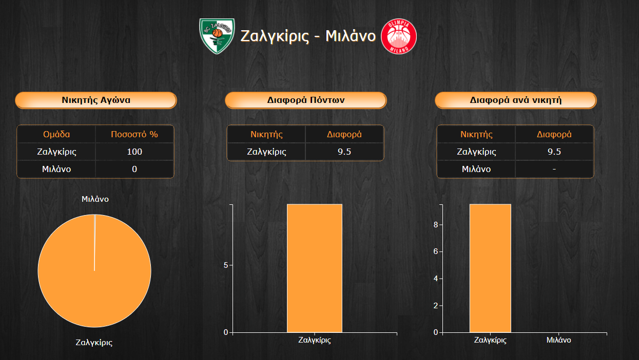 - Ο Pangos είναι ο πιο παραγωγικός παίκτης της Ζαλγκίρις με πρωτιά σε πόντους (15,7%) και ασίστ (30,5%) για την ομάδα του, ενώ από πλευράς Μιλανέζων ο Arturas Gudaitis είναι ικανός να πληγώσει τους συμπατριώτες του καθώς καταλαμβάνει το 15,7% του συνολικού ranking της ομάδας του.