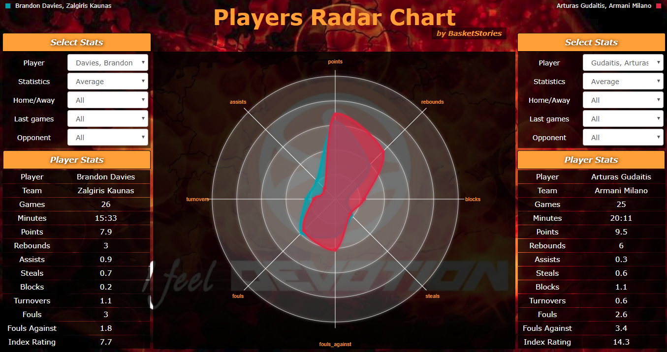Ο Brandon Davies είναι ένας από τους παίκτες που έχουν βοηθήσει σημαντικά σε πολλές νίκες τη Ζαλγκίρις επιθετικά. Δεδομένου του μικρού χρόνου συμμετοχής (μόλις 15,5 λεπτά) οι αριθμοί του δεν είναι εντυπωσιακοί με 7,9 πόντους, 3 ριμπάουντ και 1,8 κερδισμένα φάουλ ανά αγώνα. Από την άλλη πλευρά, η Αρμάνι Μιλάνο βασίζεται στη φροντ-λάιν της σε έναν Λιθουανό, τον Arturas Gudaitis. Ο σέντερ της ιταλικής ομάδας φαίνεται να κερδίζει εύκολα τη μάχη κόντρα στον Αμερικανό με 9,5 πόντους, διπλάσια ριμπάουντ (6) και 3,4 κερδισμένα φάουλ σε περίπου 20 λεπτά ανά παιχνίδι. Ο Λιθουανός έχει κάτι λιγότερο από το διπλάσιο ranking με 14,3 μονάδες έναντι 7,7 του – ανεβασμένου τελευταία - Davies.