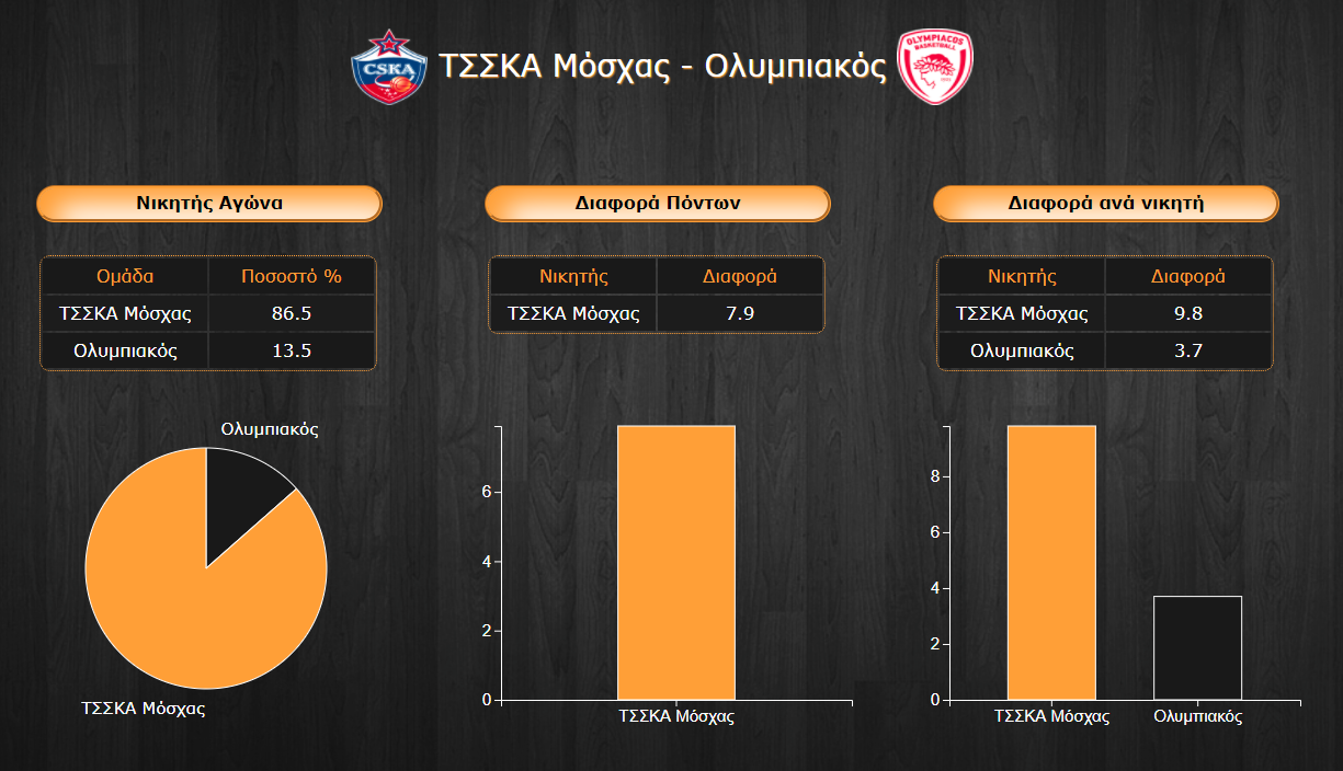 Η εξαιρετική αγωνιστική κατάσταση της ΤΣΣΚΑ Μόσχας και συνολικά η εικόνα της στην κανονική περίοδο που της εξασφάλισε δίκαια την πρωτιά οδηγούν τη μεγάλη πλειοψηφία στην επιλογή του άσσου σε ποσοστό 86,5%. Από την άλλη πλευρά, ένα 13,5% του κοινού εμπιστεύεται τον Ολυμπιακό καθώς συνήθως οι αναμετρήσεις των δύο ομάδων εξελίσσονται σε ντέρμπι με τους ερυθρόλευκους να αποτελούν παραδοσιακά πλέον τον κακό δαίμονα των Ρώσων, τουλάχιστον όσον αφορά τα Final 4. Η μέση διαφορά διαμορφώνεται στους 7,9 πόντους για τη νίκη της ομάδας του Δημήτρη Ιτούδη ενώ αγγίζει τους 9,8 πόντους ανάμεσα στις προβλέψεις που επιλέγουν τη νίκη των γηπεδούχων.