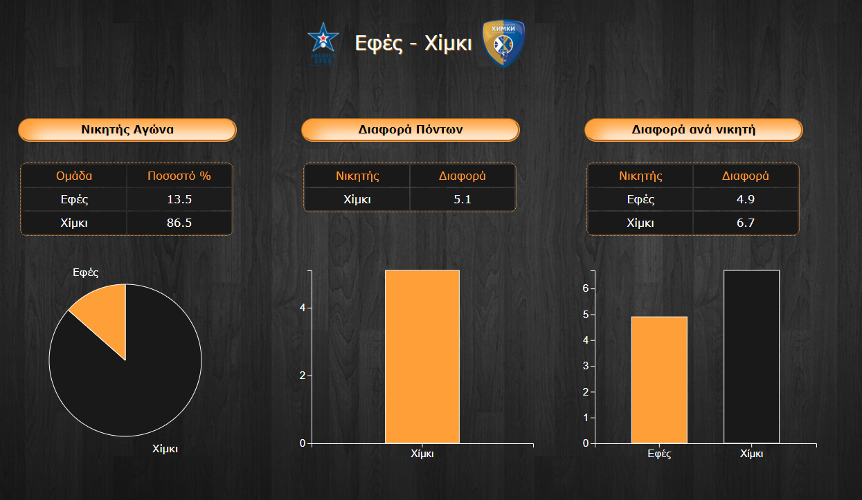 - Η παρουσία των ψηλών της Εφές είναι αυτή που ξεχωρίζει στατιστικά με τον Dunston να κατέχει το κορυφαίο ranking ανάμεσα στους παίκτες σαν ποσοστό επί του ομαδικού (18,8%) ενώ στην περιφέρεια ξεχωρίζουν λόγω της ικανότητας στην προσωπική φάση οι McCollum και Weems. Από την άλλη πλευρά, το βαρύ χαρτί της Χίμκι δεν είναι άλλος από τον πρώτο σκόρερ της φετινής σεζόν Alexey Shved ο οποίος συγκεντρώνει το 23,7% του συνολικού ranking της ομάδας του. Πέρα από τον Ρώσο γκαρντ, η Χίμκι παρά τα προβλήματα συνεχίζει να έχει θεωρητικά πιο λειτουργικό και ποιοτικό ρόστερ παραμένοντας όμως απρόβλεπτη και ασταθής σε αρκετά παιχνίδια.