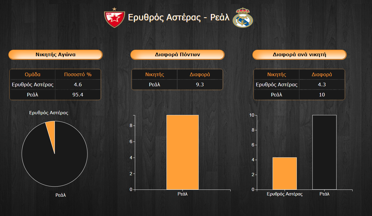 - Η διαφορά ποιότητας ανάμεσα στις δύο ομάδες είναι έκδηλη. Η Ρεάλ Μαδρίτης με τριψήφιο ranking (102,3) και 85,7 πόντους κατά μέσο όρο είναι φανερό ότι κινείται σε άλλες ταχύτητες συγκριτικά με τον Ερυθρό Αστέρα των 77,6 πόντων κατά μέσο όρο και με μια άμυνα που κρίνεται ανεπαρκής για τόσο δύσκολα παιχνίδια (83,6 πόντοι κατά μέσο όρο).